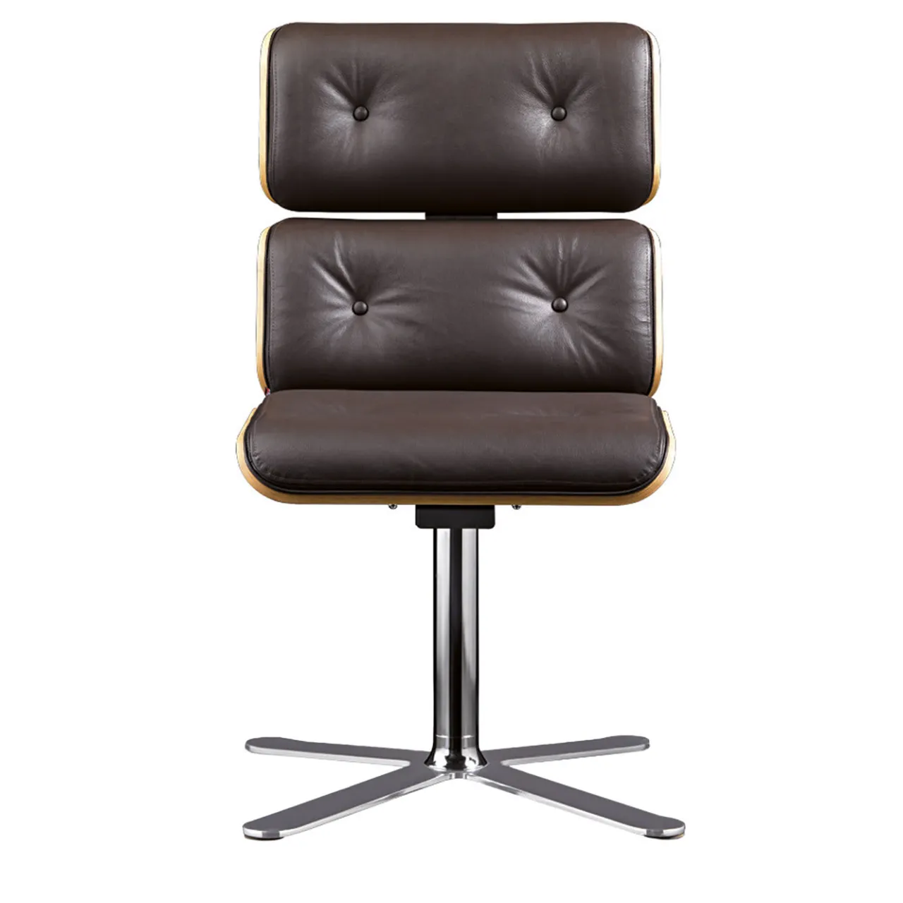Intrinsecamente moderna, questa sedia da ufficio elegante e raffinata è l’epitome del comfort. Questo design esclusivo di Rainer Bachshmid è caratterizzato da due elementi curvi sullo schienale e da uno più grande per il sedile, realizzati in multistrato di faggio impiallacciato con finitura noce canaletto, ognuno dei quali è imbottito e rivestito in pregiata pelle italiana marrone scuro. La base a 4 razze in acciaio cromato è dotata di un meccanismo di ritorno della seduta. La collezione Armadillo è disponibile in due versioni (con e senza braccioli) e con schienale alto in stile lounge; per maggiori dettagli, contattare il Concierge.