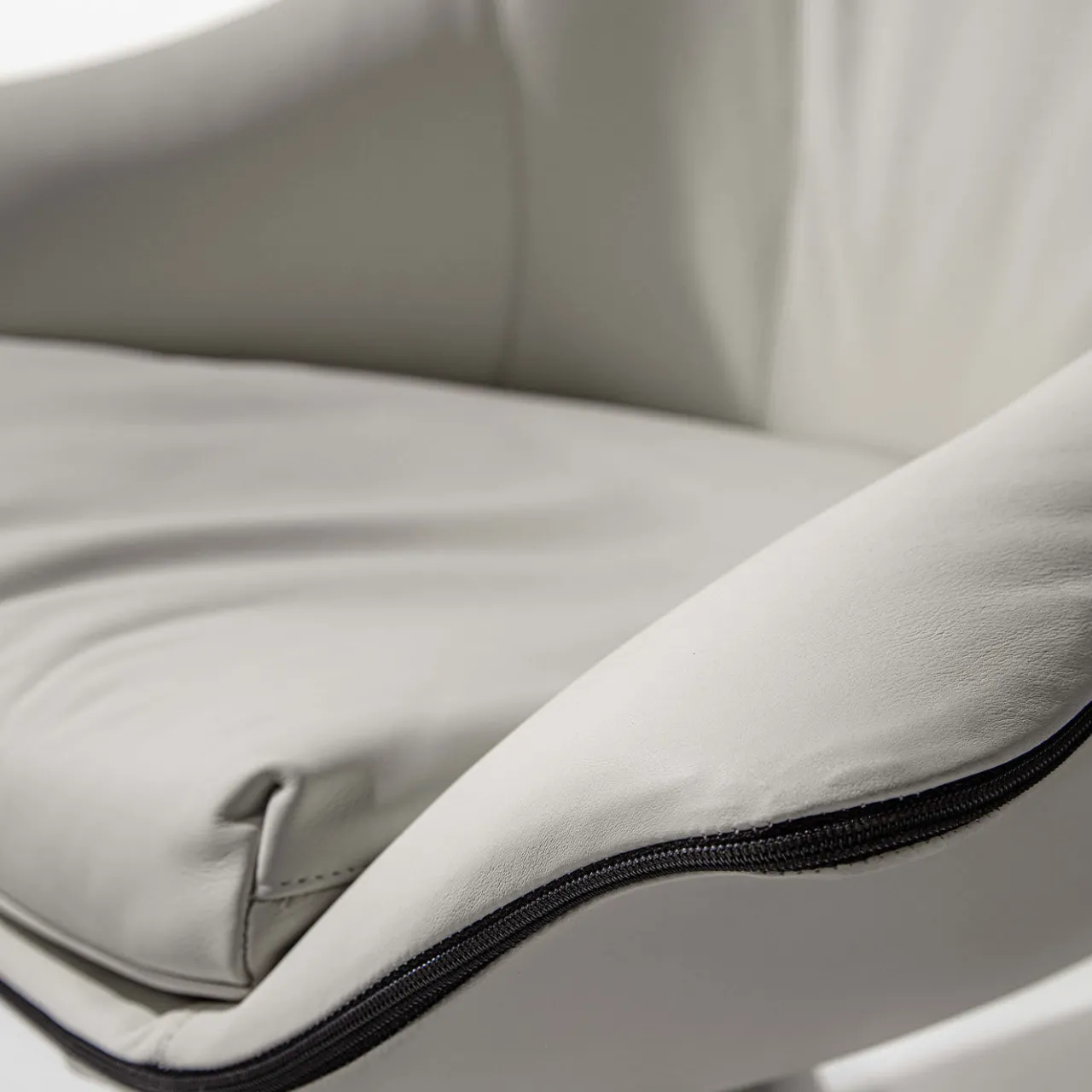 Privilegiando il comfort senza scendere a compromessi, questa poltrona è l’epitome dell’eleganza moderna. Con un look completamente bianco, la scocca in poliuretano con schienale alto e braccioli leggermente svasati è sostenuta da una base fissa a 4 razze e rivestita internamente in pelle pregiata (cuscino di seduta incorporato incluso). La personalizzazione è disponibile in diversi colori sia per la base che per il rivestimento (anche in pelle, ecopelle e tessuto del cliente). Il pouf non è incluso, ma può essere acquistato separatamente, chiedendo al Concierge.