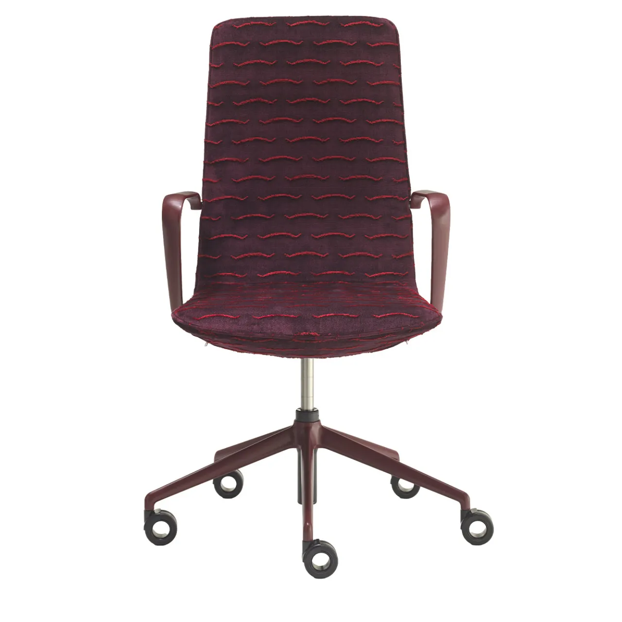 La poltrona imbottita L-Air presenta un meccanismo di inclinazione sincronizzata attivato dal peso con uno schienale di 18° e un’angolazione della seduta di 1°. L’inclinazione dello schienale può essere bloccata in qualsiasi posizione utilizzando una leva attivata da cavo, che controlla anche la regolazione dell’altezza. La sedia include braccioli e base in alluminio verniciato, con ruote nere da 65 mm progettate per un movimento fluido. Rivestita in tessuto Dedar, combina funzionalità ergonomica con uno stile moderno per l’ufficio.