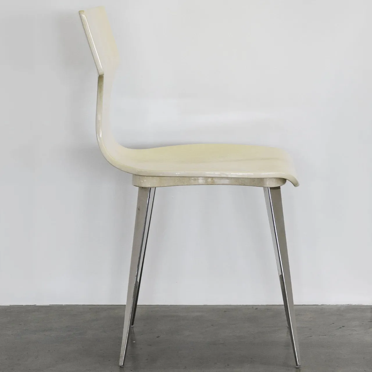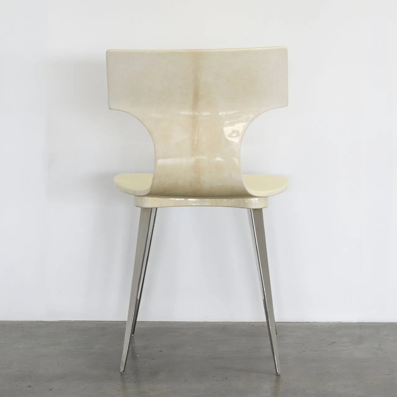 Dinamica e preziosa, questa sedia vanta una scocca robusta e sagomata con un design ergonomico che promette un comfort duraturo. Il suo tratto distintivo è la pregiata pergamena naturale di capra che avvolge completamente la scocca, rifinita da una finitura lucida che esalta ogni dettaglio della sua texture unica. I piedini in acciaio inox extra-lucido completano il design. Ideale l’abbinamento con il tavolo con piedistallo in pelle di capra.