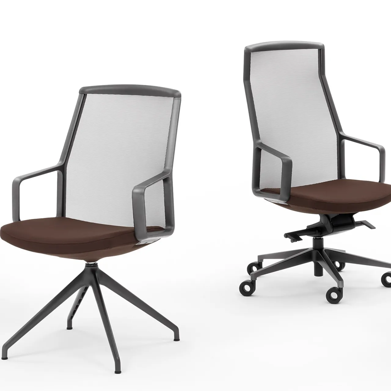Adele è la nuova famiglia di sedie di Viganò Office. Sedia direzionale con telaio in alluminio pressofuso verniciato antracite, rivestimento dello schienale in rete portante antracite, meccanismo oscillante in alluminio nero Lusso, alzata a gas, con braccioli, base a 5 razze in alluminio verniciato antracite con ruote perforate di 65 mm di diametro. Rivestita in tessuto ignifugo di colore castagno. Si prega di chiedere al Concierge per le opzioni di personalizzazione.