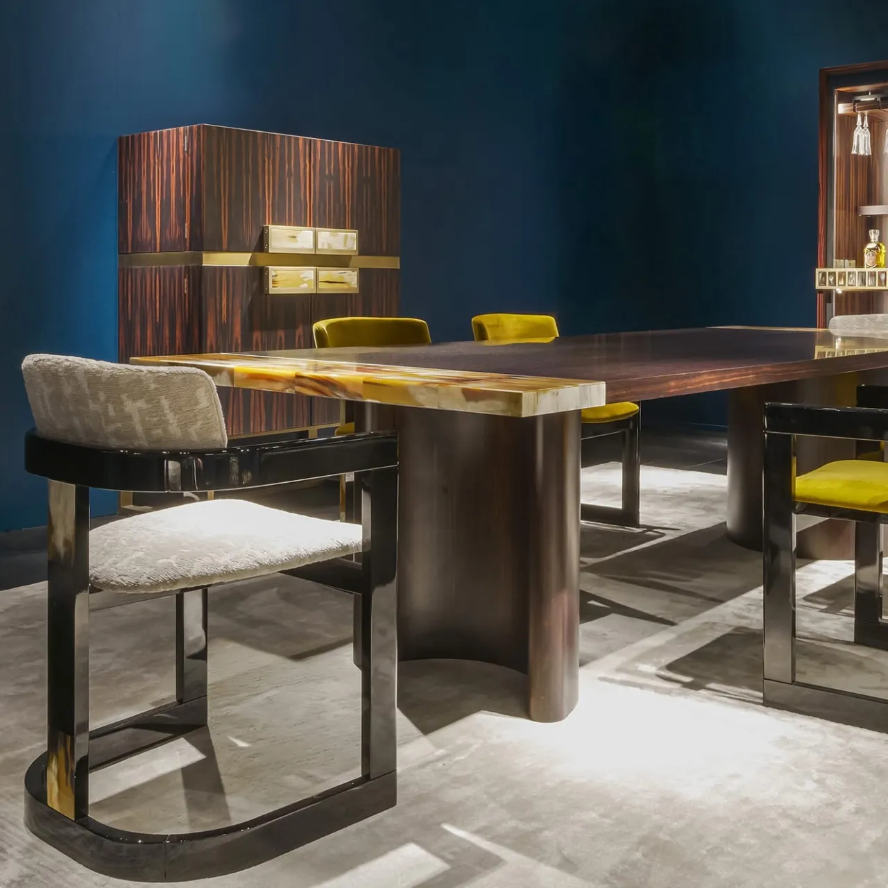 Essa è un’elegante sedia rivestita in Minimal Moves, un tessuto bianco che offre un’estetica elegante e moderna. La struttura è realizzata in legno con finitura laccata nera lucida, completata da eleganti intarsi in corno lucido che aggiungono un tocco di raffinatezza. Perfetta per gli interni contemporanei, Essa combina comfort e design, rendendola un’aggiunta raffinata a qualsiasi spazio.