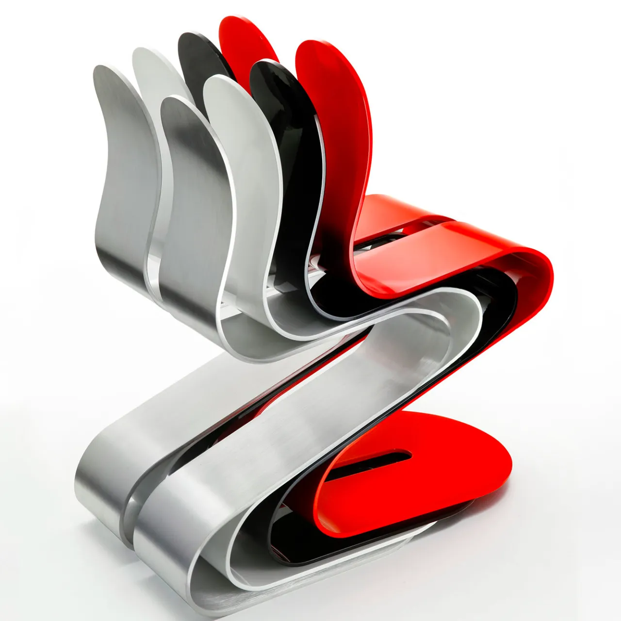 Elegante, ergonomica e impilabile, questa sedia è l’epitome del comfort e della funzionalità moderni. Realizzata interamente a mano con un unico pezzo di alluminio satinato piegato a formare una silhouette a nastro, questa sedia è adatta sia per interni che per esterni. Le curve sinuose forniscono sostegno alla schiena, mentre il taglio centrale conferisce flessibilità all’intera struttura contribuendo a migliorare la circolazione. L’altezza della seduta è di 46 cm.
