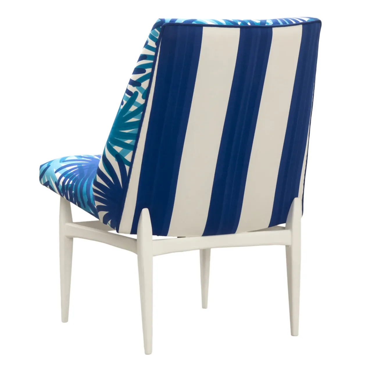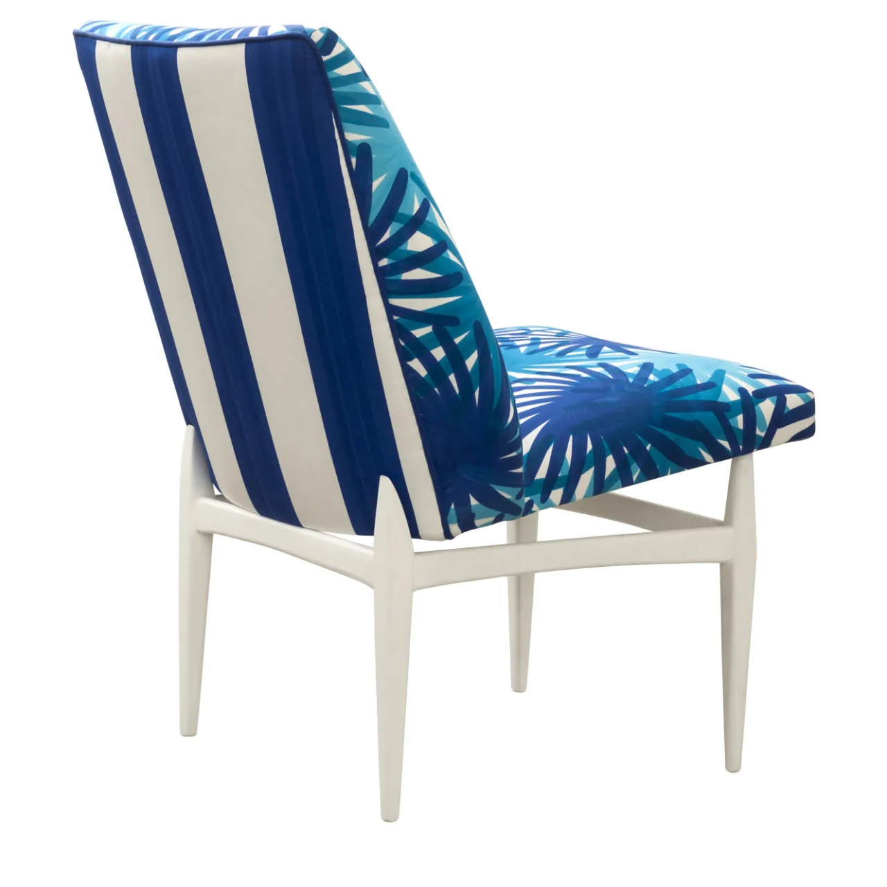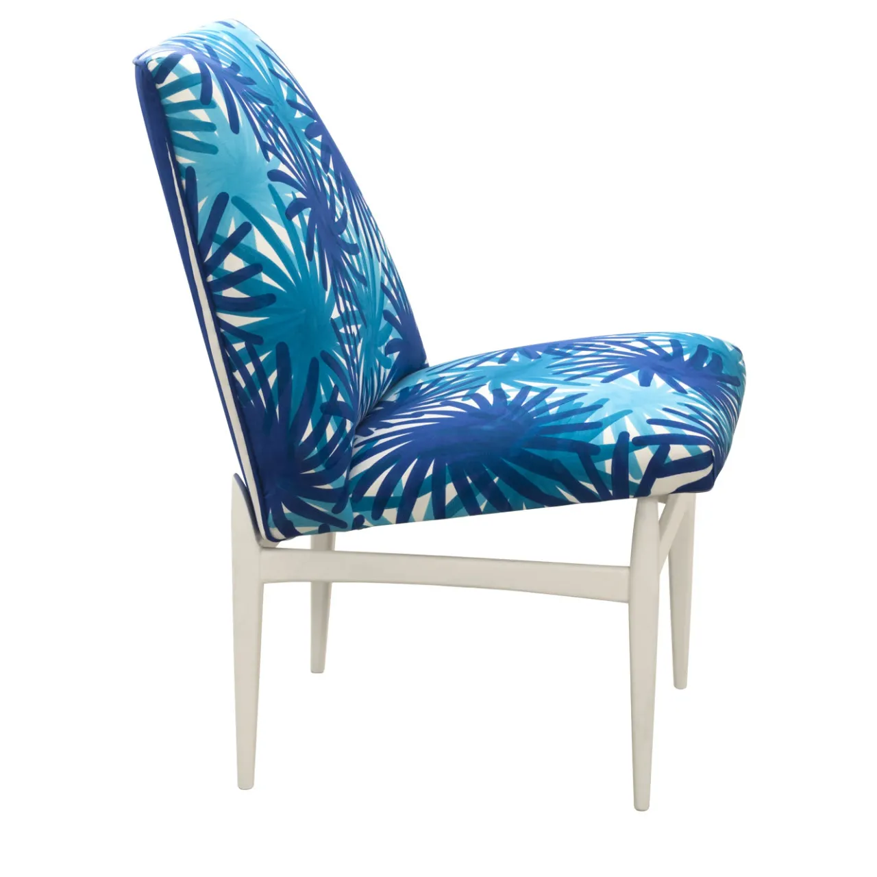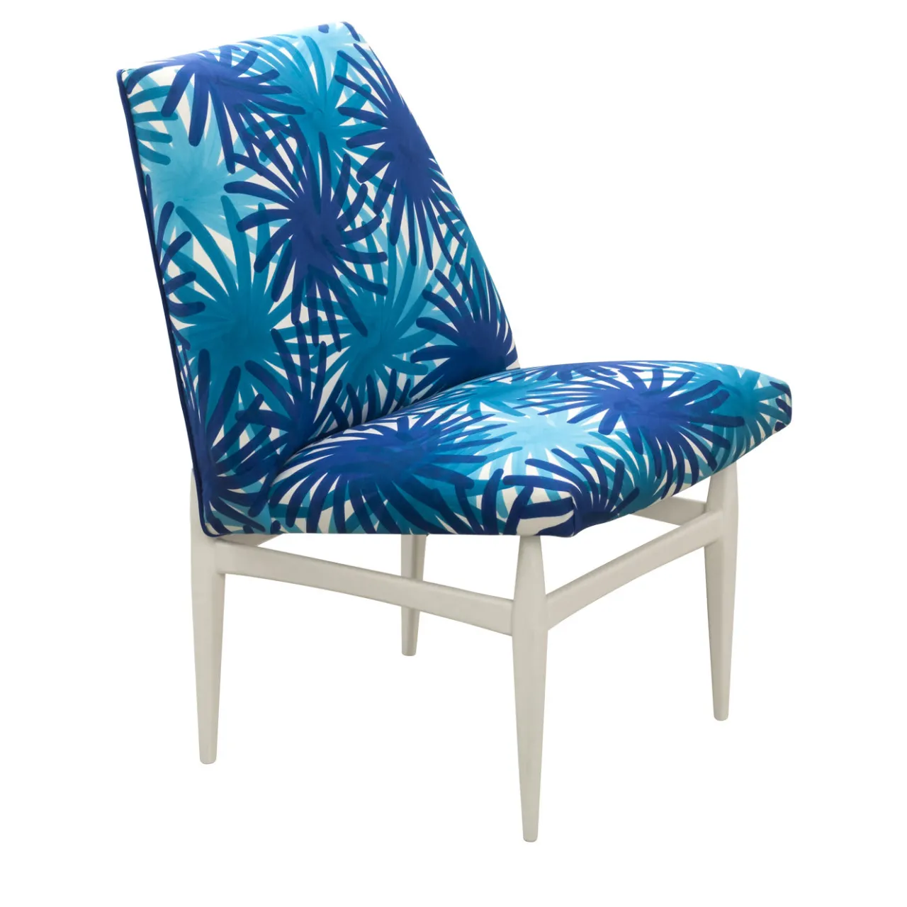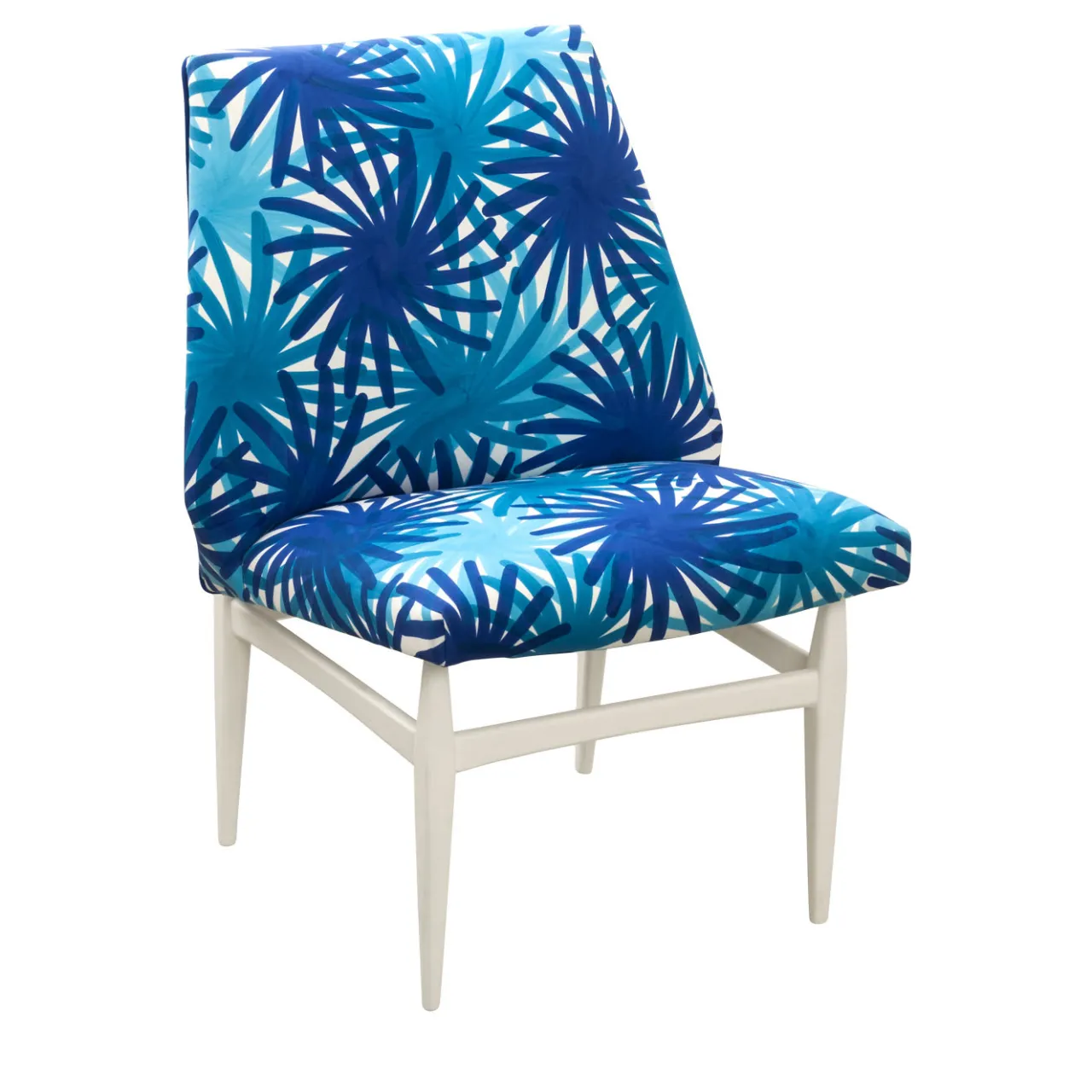 Questa elegante sedia ha una struttura in legno rifinita con smalto bianco. La seduta e lo schienale sono rivestiti in cotone 100% decorato con la tecnica della stampa a pigmenti con un motivo di fuochi d’artificio blu e turchese.