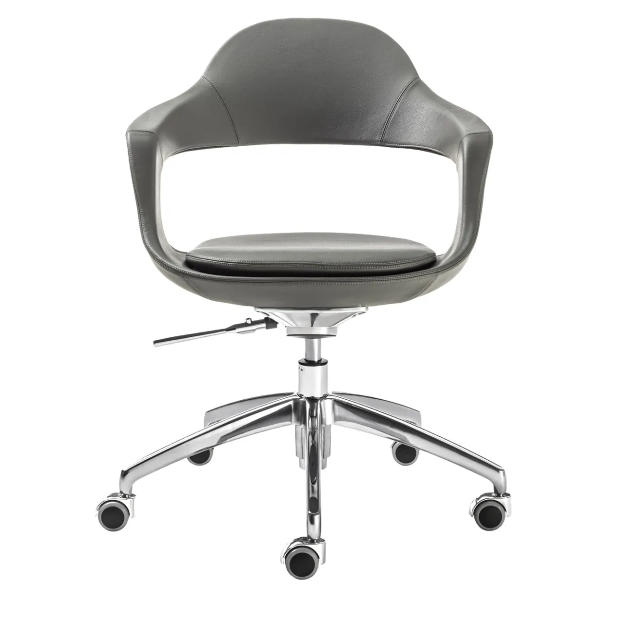 La sedia girevole Frenchkis unisce un design elegante a un comfort eccezionale. Presenta una base a cinque razze in cromo lucido per un look raffinato e moderno. La scocca con schienale alto e cuscino di seduta sottile integrato offre sostegno ed eleganza. Costruita con una struttura interna in acciaio e imbottita in poliuretano espanso, rivestita in pelle ma disponibile anche in una selezione di materiali di rivestimento di alta qualità. Un mix perfetto di stile e funzionalità. Contattate il concierge per maggiori dettagli.