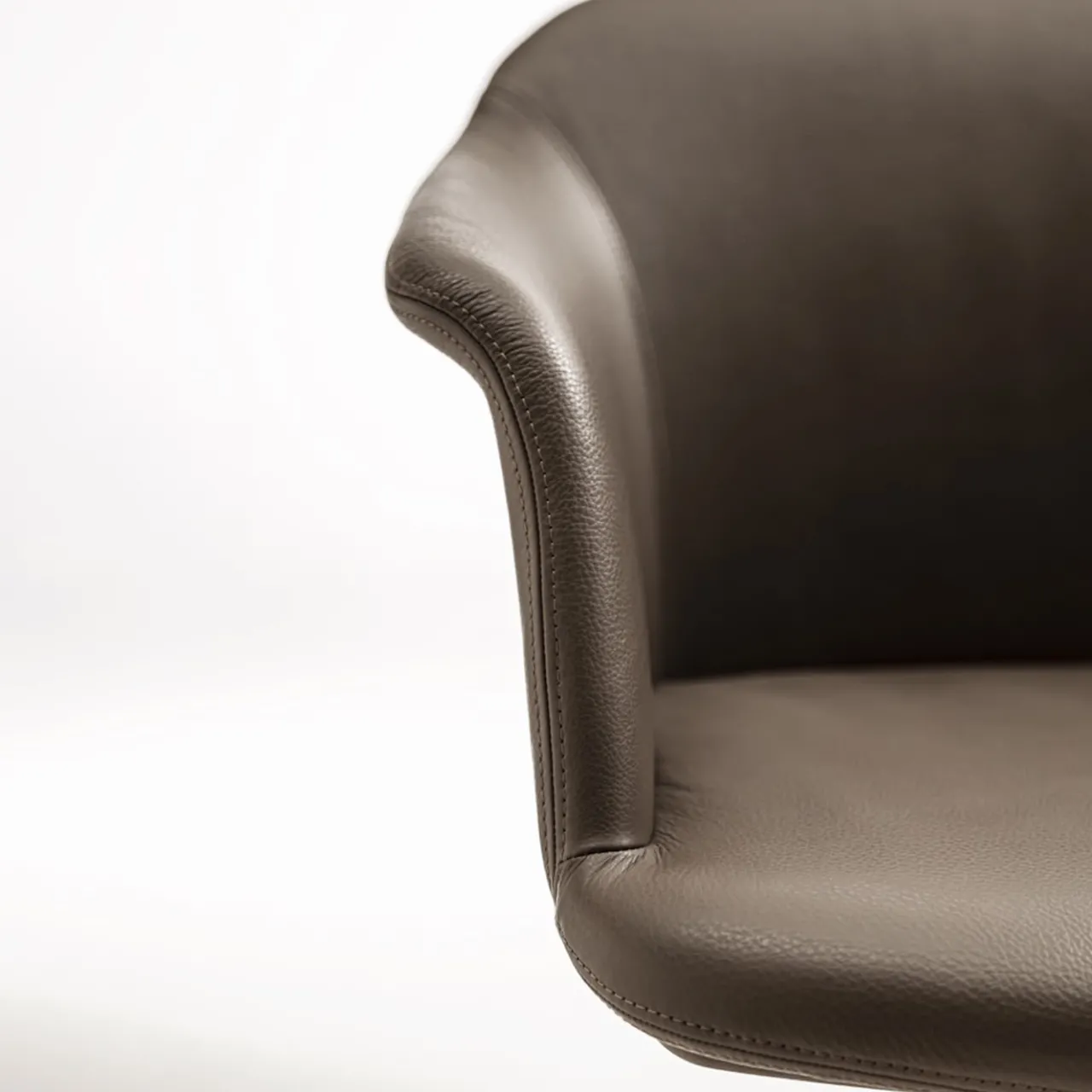 La sedia girevole imbottita Eva ha una scocca in poliuretano rigido imbottita e rivestita in morbida pelle color tortora e una base a cinque stelle verniciata in cromo. È possibile regolare l’altezza. Chiedete al Concierge le opzioni di personalizzazione.