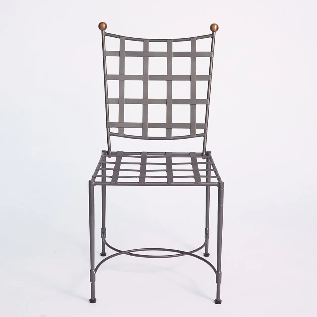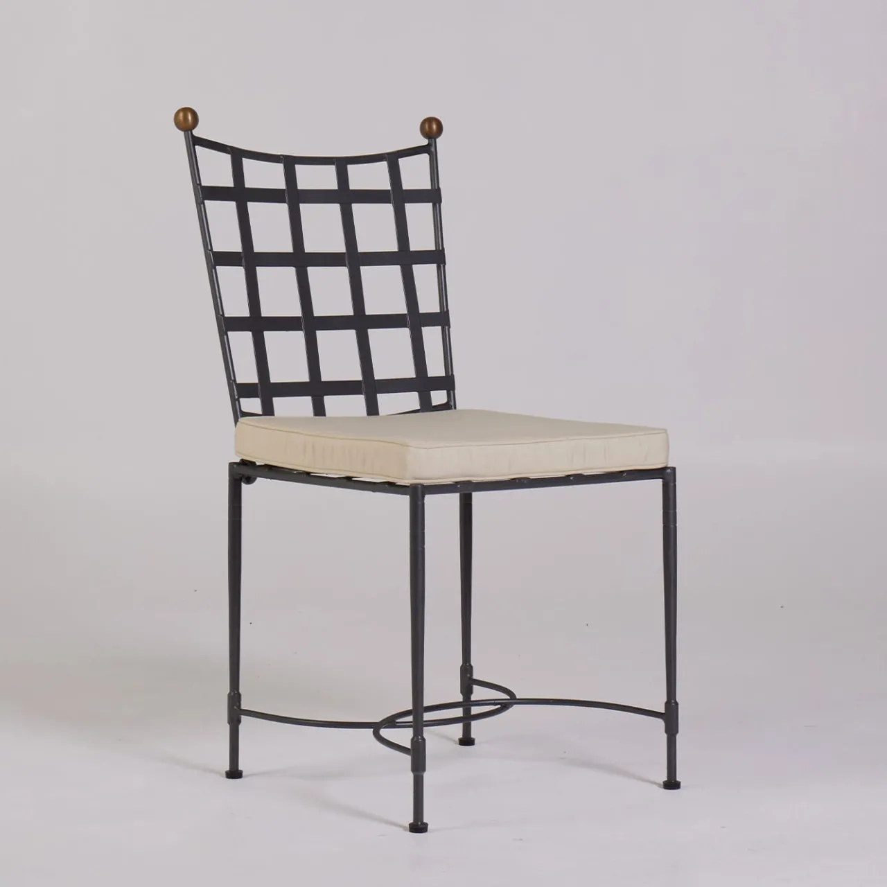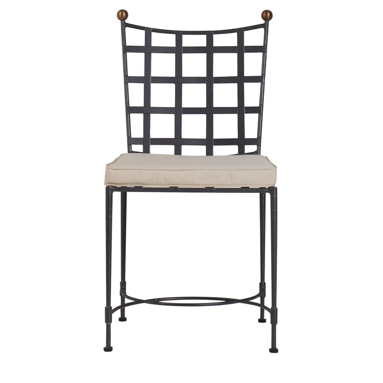 Un design elegante per godersi i momenti all’aperto, questa sedia artigianale è stata progettata pensando alla classe e al comfort. Il rivestimento del cuscino Sunbrella “Canvas” beige, sfoderabile oltre che resistente all’acqua e alle macchie, massimizza la protezione già assicurata dalla struttura in ferro a intreccio, zincata a caldo e verniciata a fuoco in grigio grafite. I pomelli in ottone brunito e le barelle ricurve completano il design.