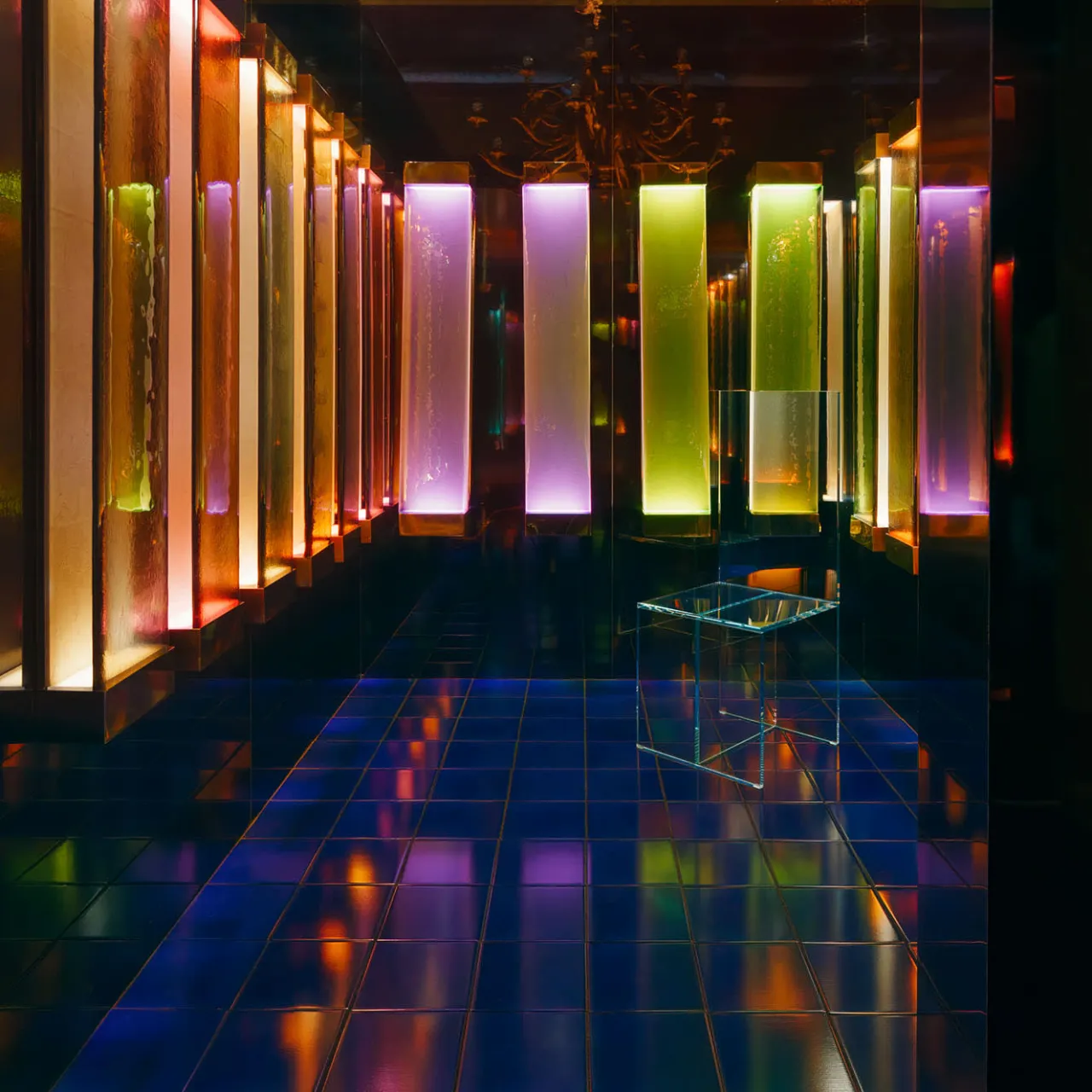 Composta da quattro pezzi di vetro temperato trasparente extralight, questa splendida sedia presenta uno schienale alto 104 cm che conferisce al design un aspetto drammatico. I pezzi di 15 mm di spessore sono incollati tra loro per ottenere il massimo effetto visivo. Disponibile anche in 4 finiture di colore (vetro colorato trasparente, vetro colorato opaco, vetro diffusore e vetro colorato lucido), queste versioni sono magistralmente ottenute laminando una pellicola trasparente colorata tra due pezzi di vetro temperato di 8 mm di spessore.