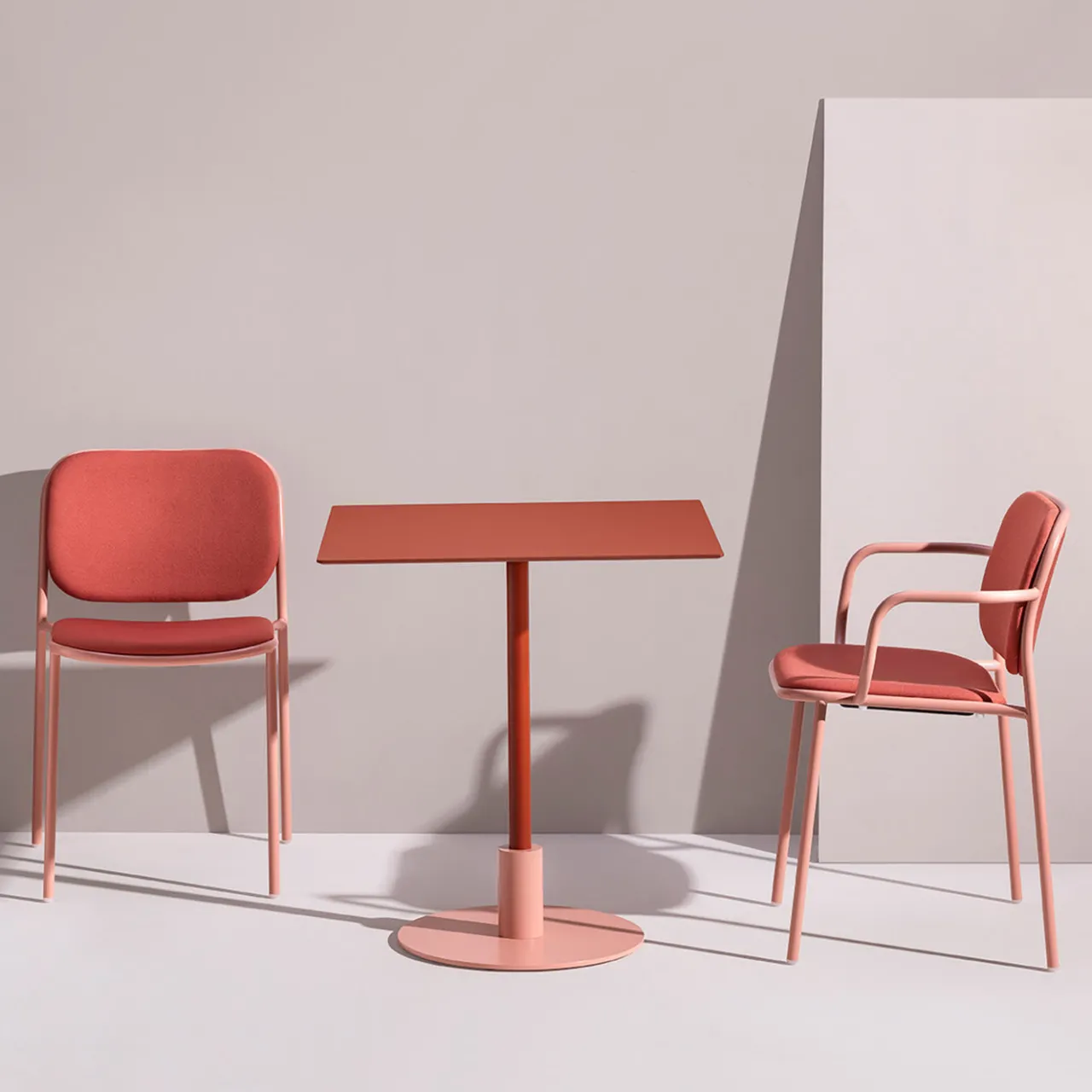 Ideale come capotavola se riunita con le sue controparti, questa sedia emana un fascino particolare in cui influenze vintage e contemporanee si fondono senza sforzo. La struttura in tubolare metallico – che rifiuta le spigolosità a favore di curve accattivanti – completa la seduta ergonomica e lo schienale leggermente curvo, entrambi imbottiti e rivestiti in tessuto rosso (Camira Era CSE29) per un maggiore comfort.