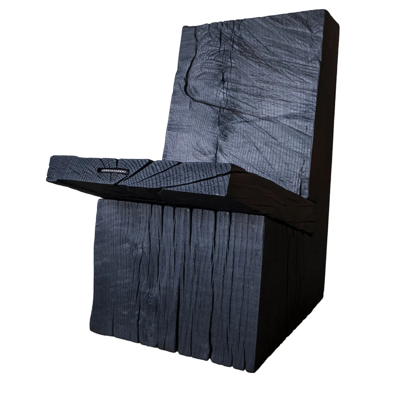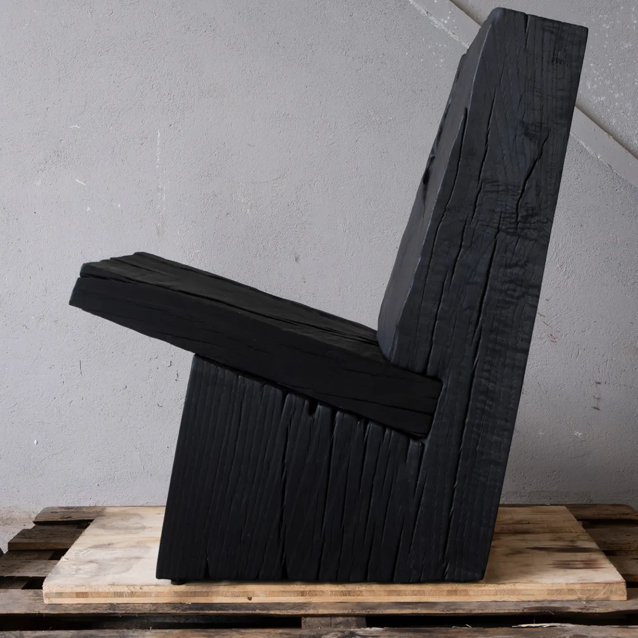 Questo pezzo è più di una semplice sedia, è una scultura monolitica, scolpita a mano da un tronco di quercia massiccia. I segni della lavorazione del legno aggiungono carattere e autenticità, mentre la finitura nera e lucente è ottenuta attraverso la cottura naturale del legno, che mette in evidenza le venature e i dettagli fatti a mano. Ogni pezzo è unico, modellato dai nodi naturali, dalle fessure e dalle venature del legno. Sottili spostamenti, crepe e movimenti naturali sono intrinseci al pezzo, che celebra le sue origini organiche e il suo fascino senza tempo.