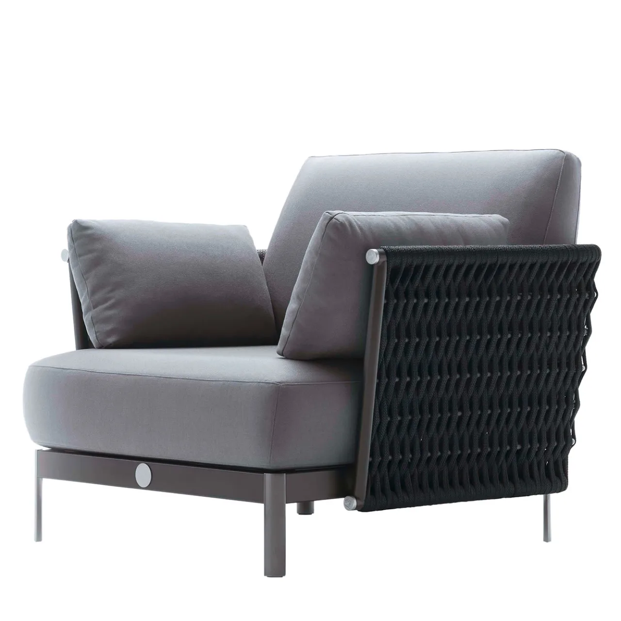 Questa sedia occasionale per esterni è disponibile in tessuto speciale trattato o in pelle di prima scelta. Imbottitura del cuscino in dacron impermeabile. Struttura in combinazione di metallo nero satinato trattato in cataforesi con logo Giorgio Collection inserito e corde nere intrecciate. Speciale copertura per esterni inclusa nel prezzo. Design di Castello Lagravinese Studio.