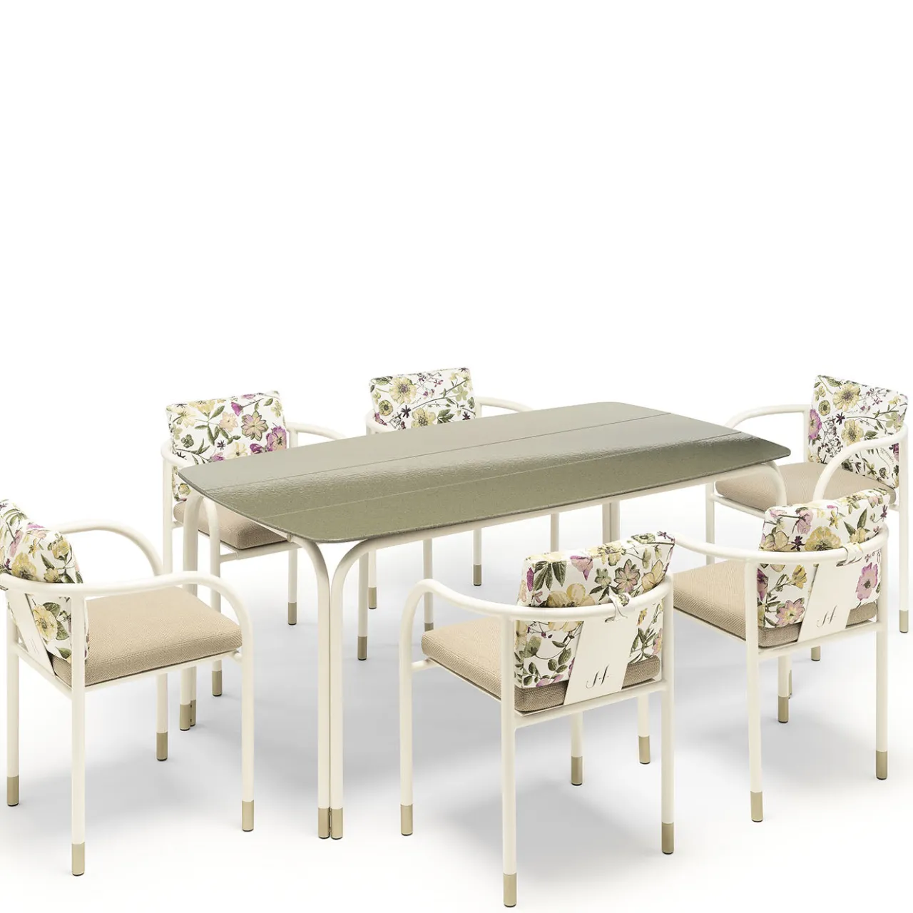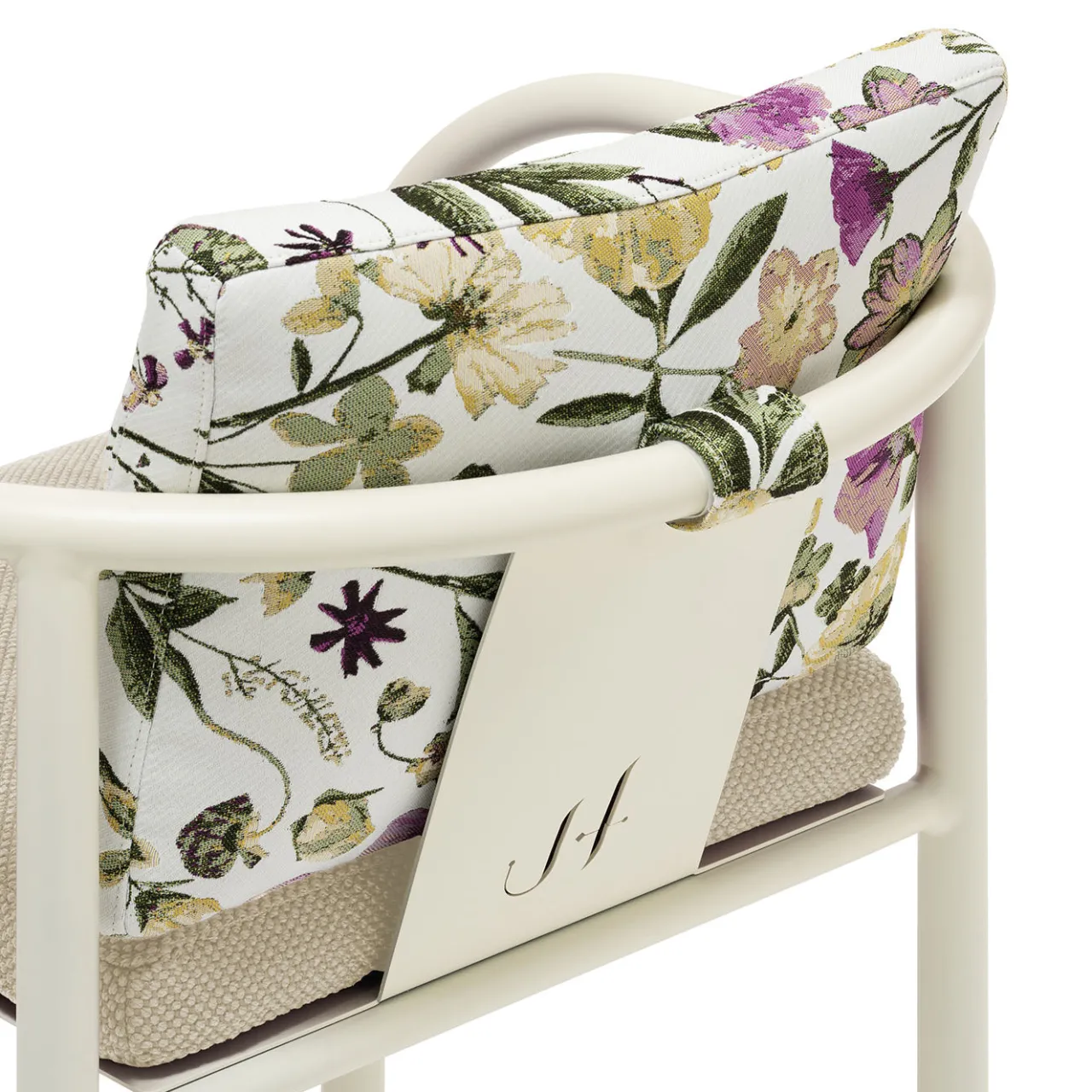 La sedia Aliya per esterni presenta un design distintivo che combina braccioli sinuosi con gambe lineari, creando una presenza iconica. Leggera e impilabile, offre facile stoccaggio e maneggevolezza. La struttura include punte metalliche con finitura champagne. I cuscini, ispirati a una collaborazione in edizione limitata con un artista specializzato in fiori pressati, sono rimovibili, lavabili e dotati di un nucleo in poliuretano non deformabile con schiuma viscoelastica per comfort e durata.