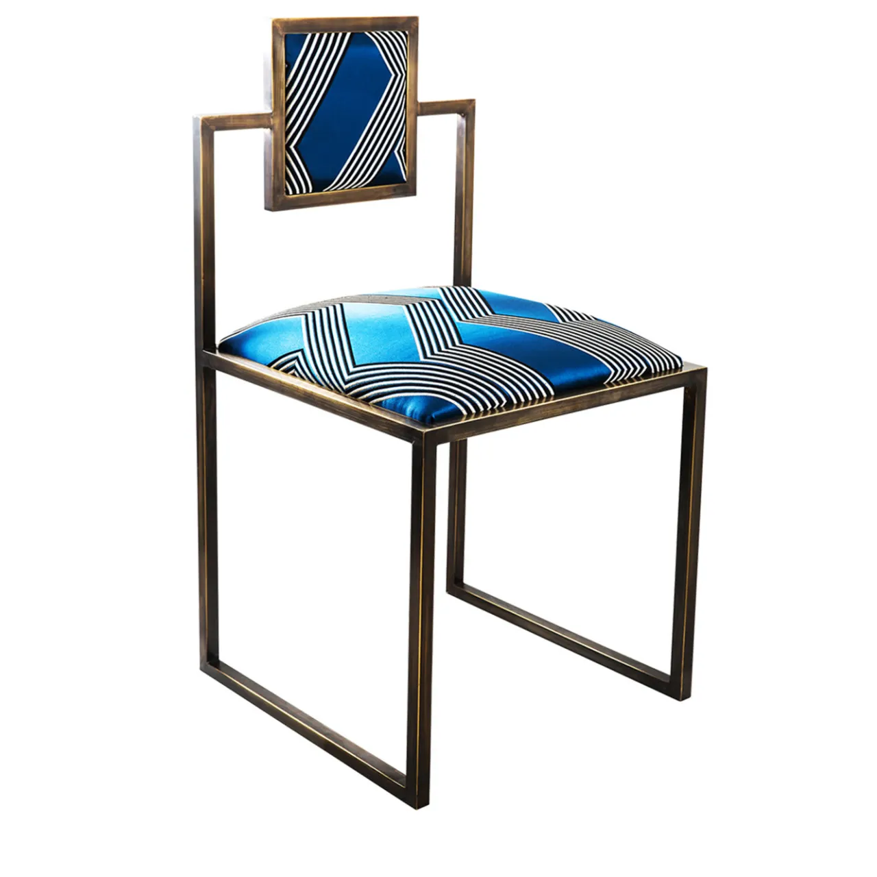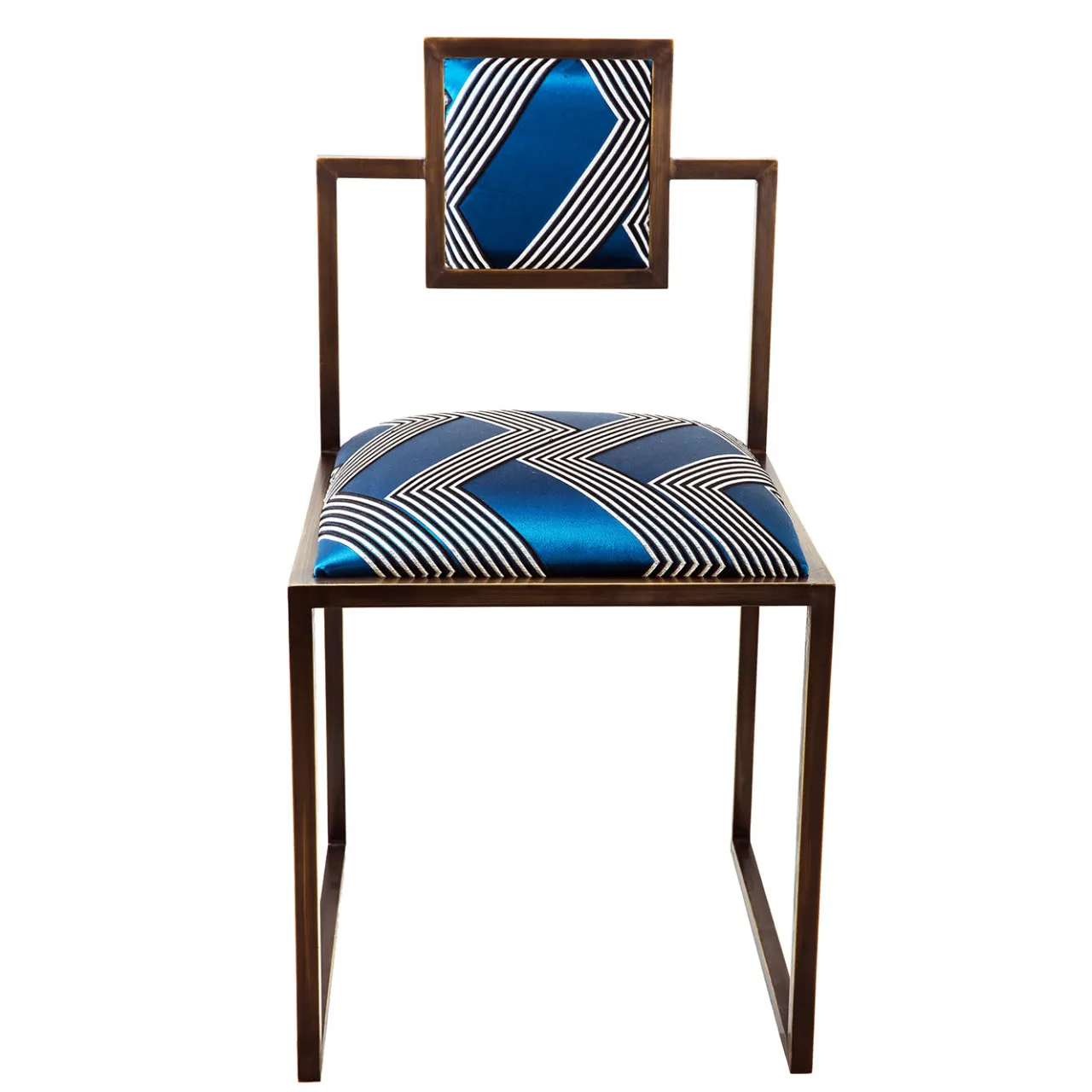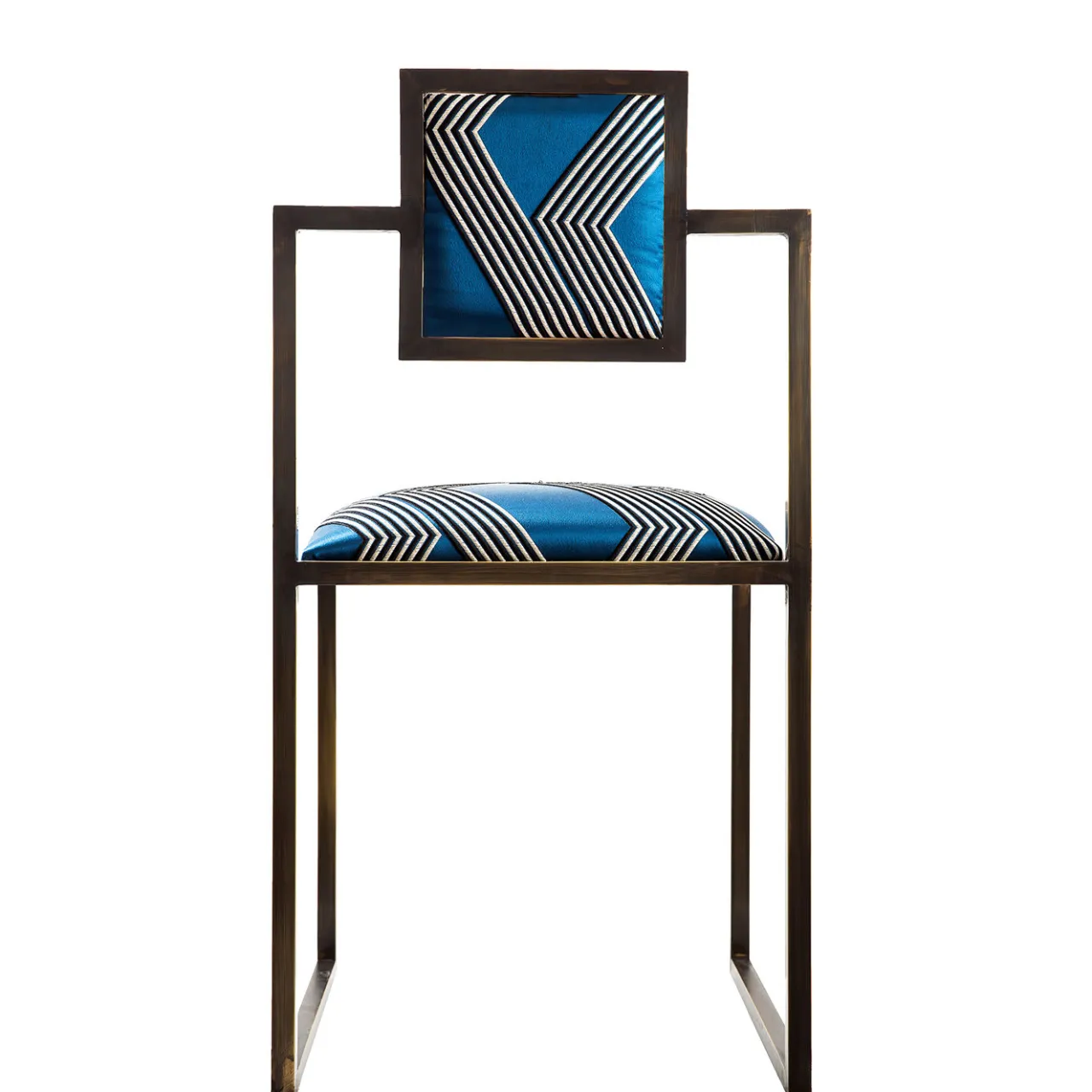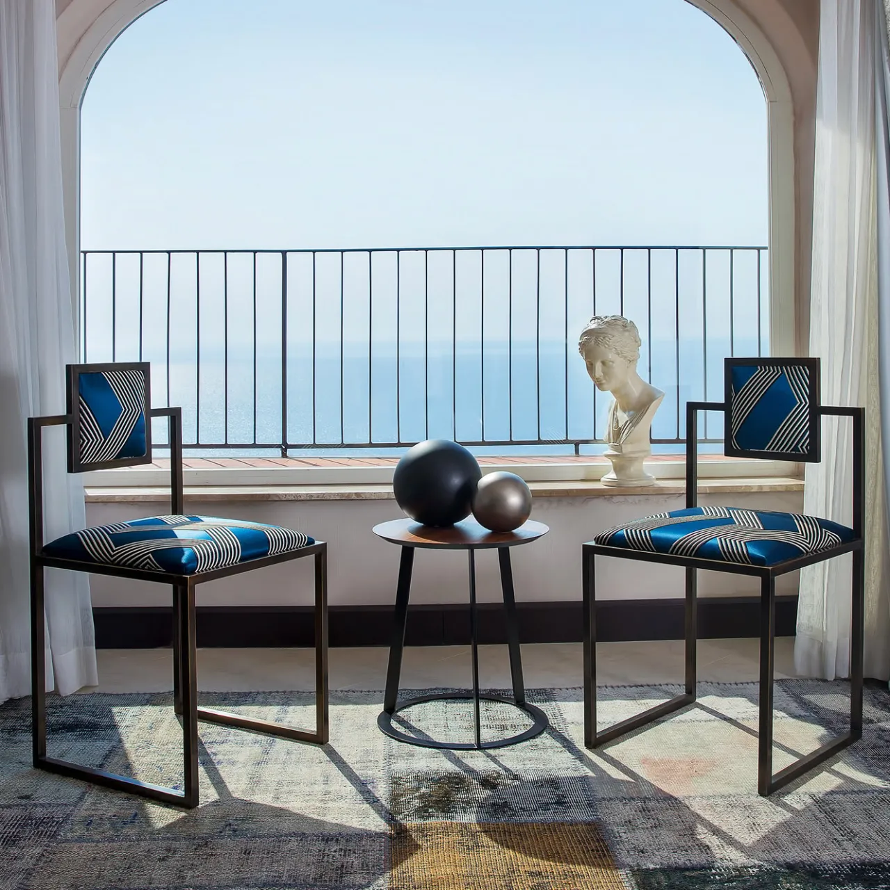 Semplice nel design, lo stile minimalista conferisce un’aria di grazia a questa sedia in ferro verniciato nero disegnata da Francesco Della Femina e realizzata a mano da abili artigiani nei dintorni di Napoli. Ispirata all’atmosfera e ai colori glamour dell’isola di Capri, la comoda seduta e lo schienale sono rivestiti in tessuto blu “Funky Stripes” di Dedar Milano.