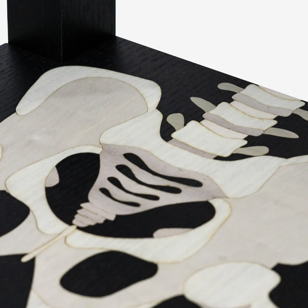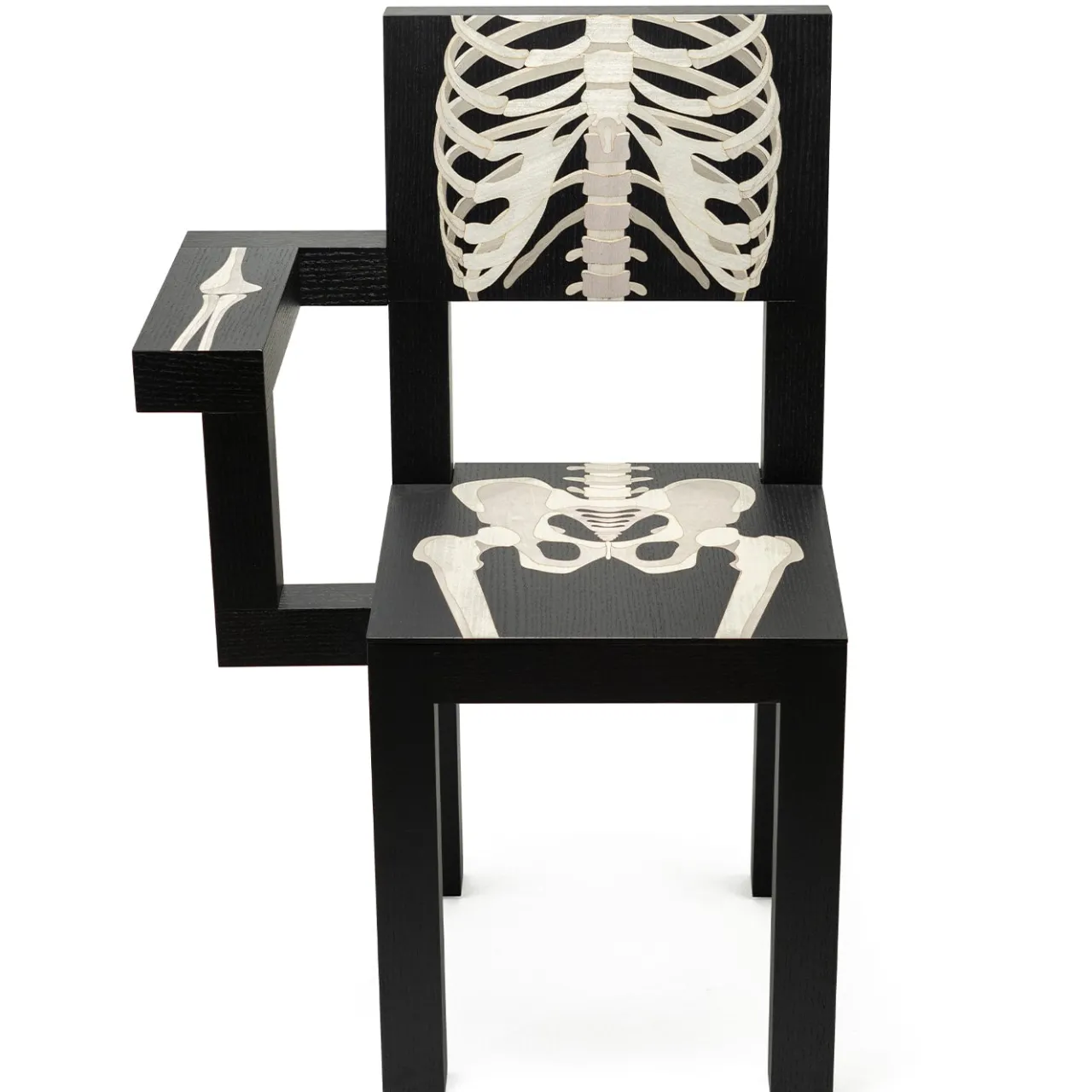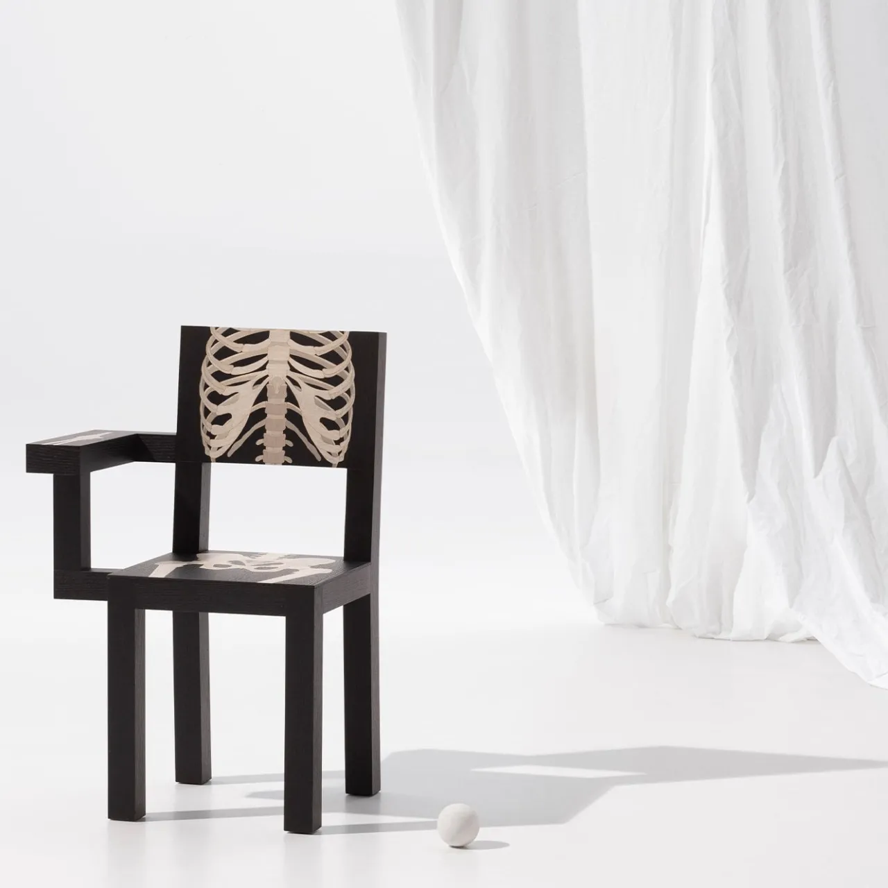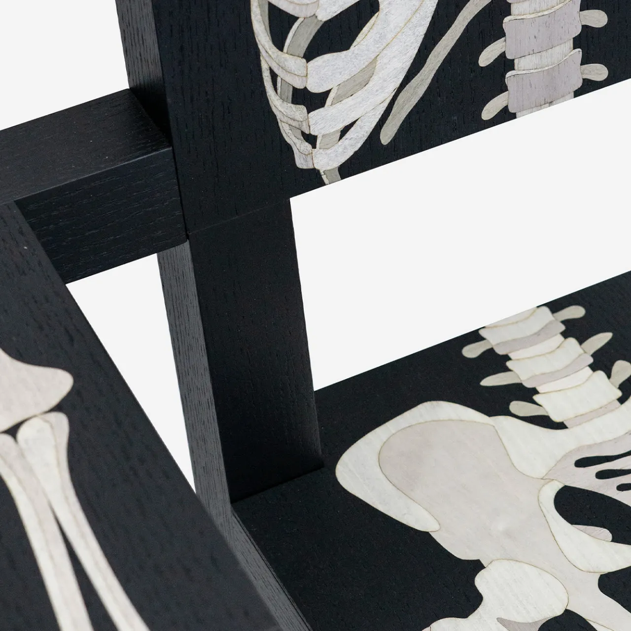 Un carattere ironico contraddistingue questa sedia in legno rigorosamente scolpita, il cui tratto distintivo è il raffinato intarsio in toni chiari di uno scheletro umano in corrispondenza delle superfici su cui poggia ogni parte del corpo. Il disegno asimmetrico della sua silhouette tinta di nero ne accresce il fascino intrigante, suggerendo un design che si adatta a case eclettiche o che ravviva ambienti sobri.