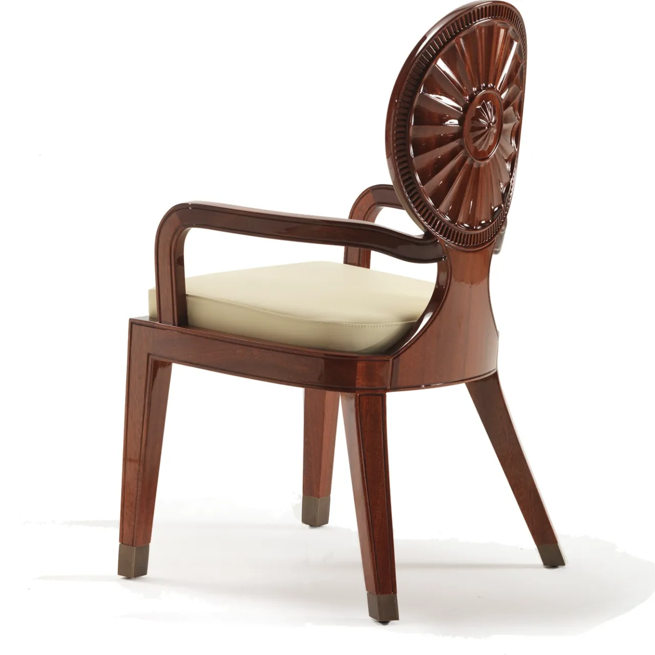 Winged Sun è un’elegante sedia da pranzo strutturata in legno, con finitura in mogano lucido. Realizzata in legno massiccio con finitura in mogano lucido, questa sedia coniuga perfettamente la grazia neoclassica e il fascino moderno. Lo schienale circolare a raggiera, ornato da una rosetta centrale, rende omaggio all’estetica classica, mentre il tocco di lusso è svelato dal rivestimento in pelle morbida su sedile e schienale.