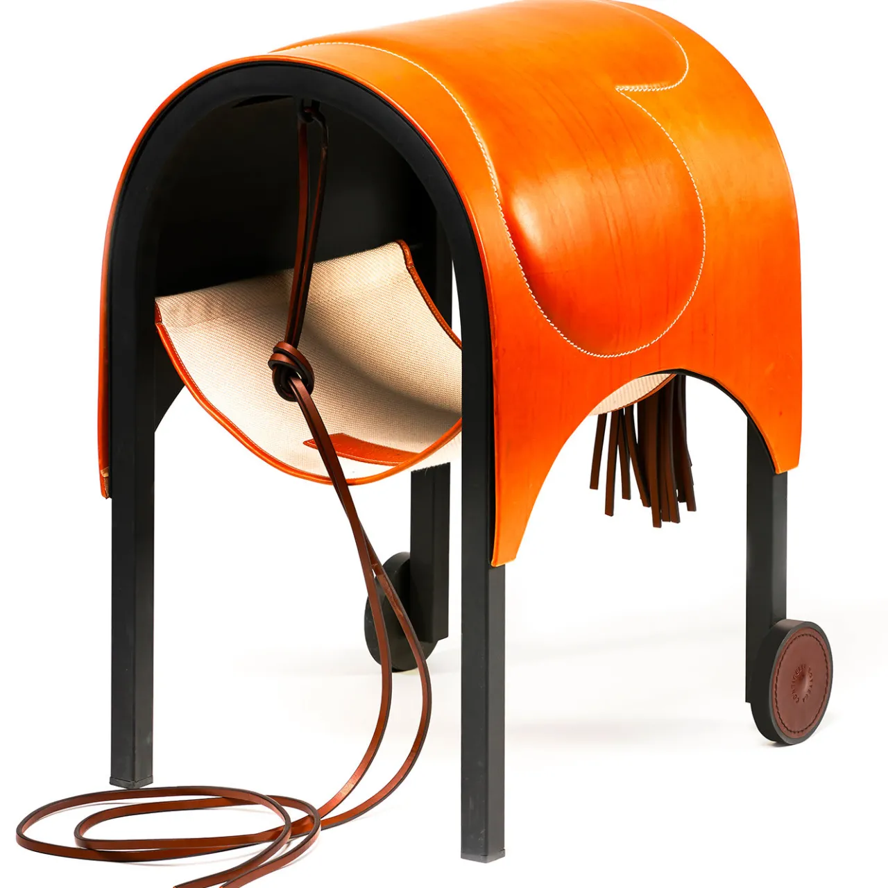 Questo sgabello unico, stravagante e minimalista a forma di sella si ispira al mondo dei cavalli e degli sport equestri. È caratterizzato da cuciture a mano, da una fragranza unica, da gambe mobili e da reggicoda e coda in pelle. Una tasca morbida consente di riporre facilmente vari oggetti. La pelle è stata trattata senza l’uso di sostanze tossiche.