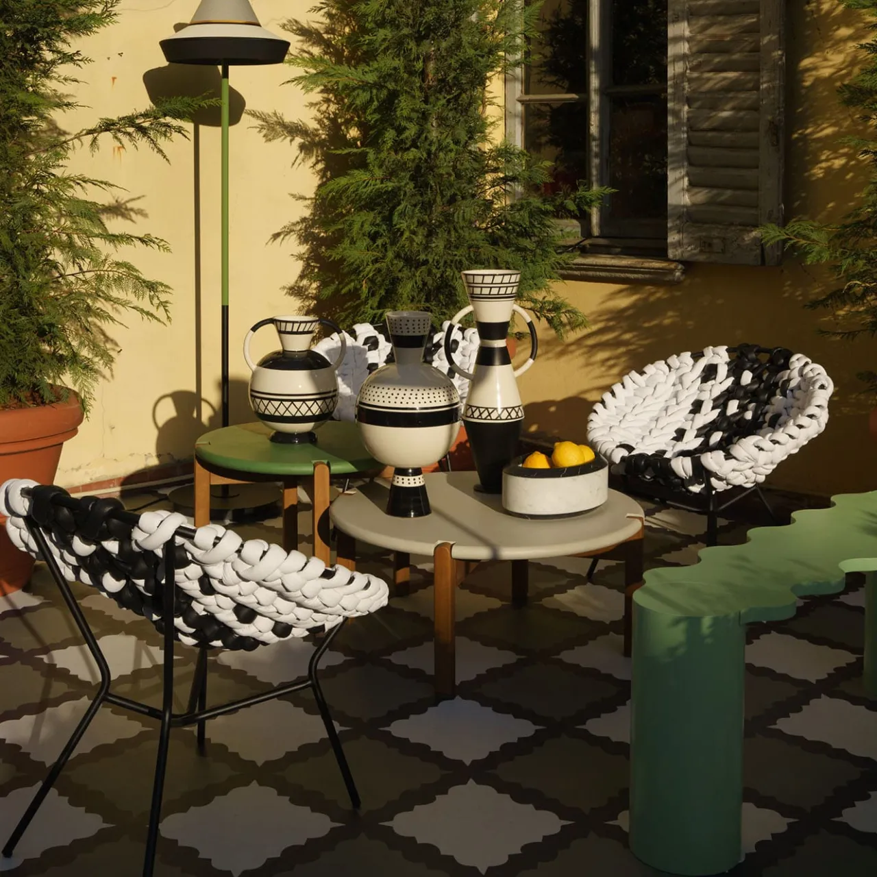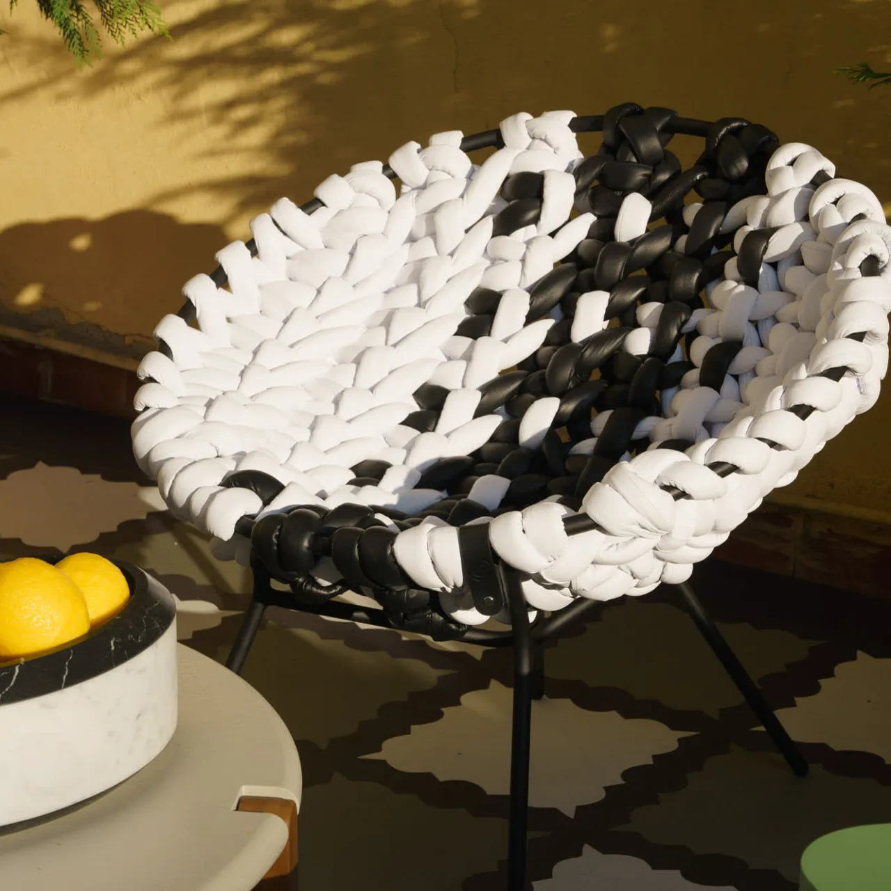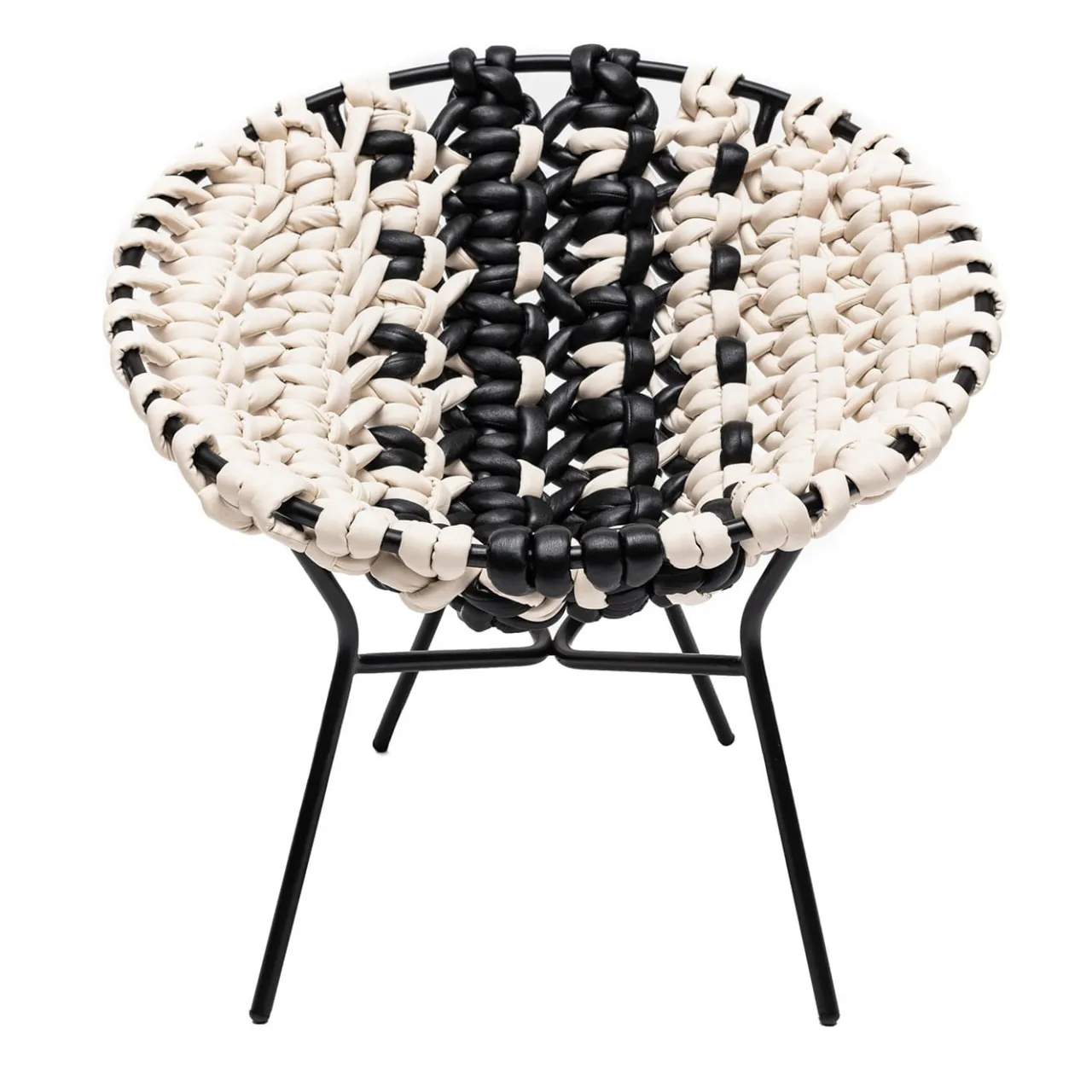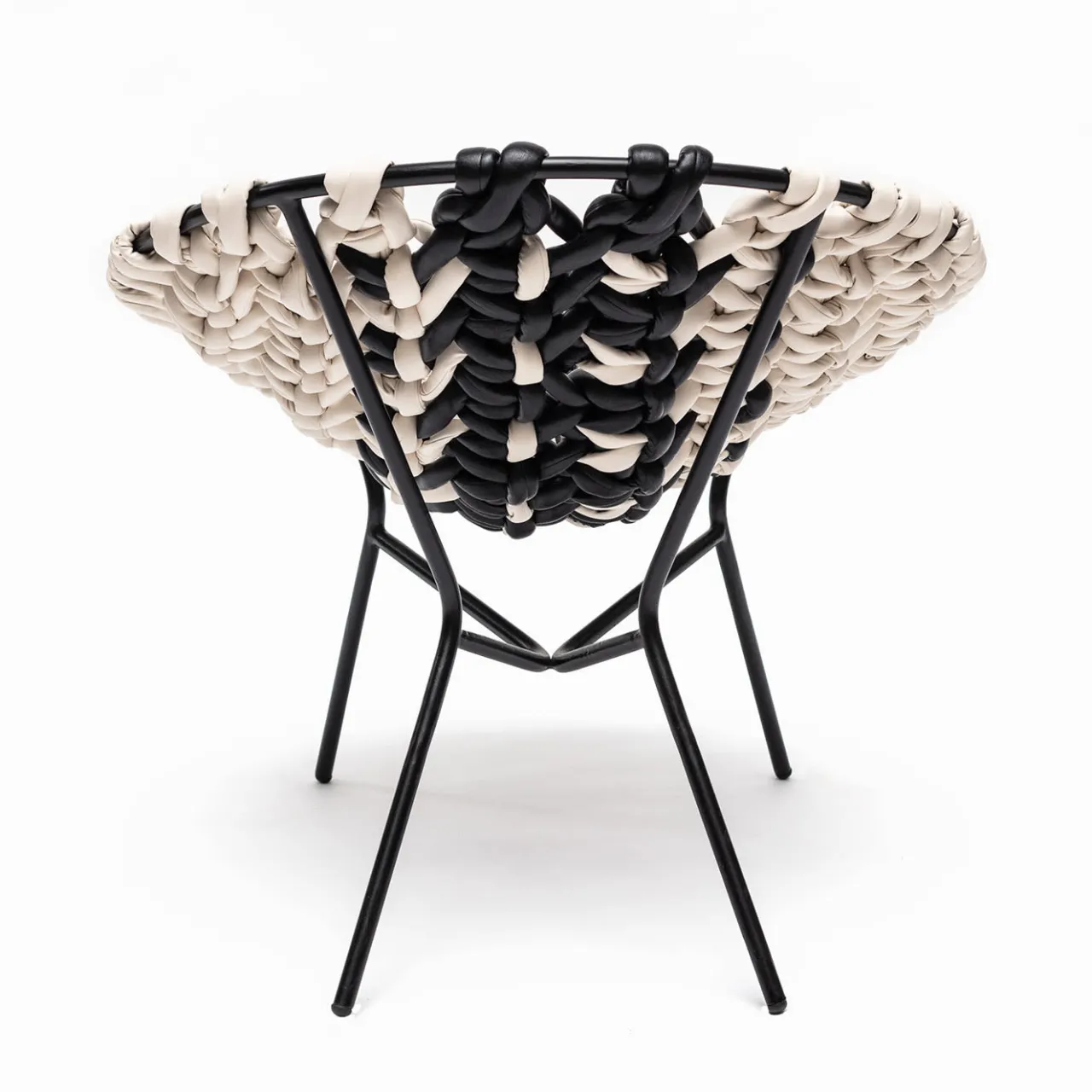 Design ispirato alle sedute da esterno con struttura metallica circolare, solitamente decorate in vimini o paglia, in voga negli anni Cinquanta. La reinterpretazione di Craafts prevede una lavorazione estremamente elaborata del pannello della seduta, che contrasta con la semplicità strutturale del tubo metallico verniciato a polvere. La lavorazione a triplo nodo, simile a un macrame, del tessuto tubolare in pelle è eseguita da esperti artigiani e garantisce una seduta confortevole e rilassante.