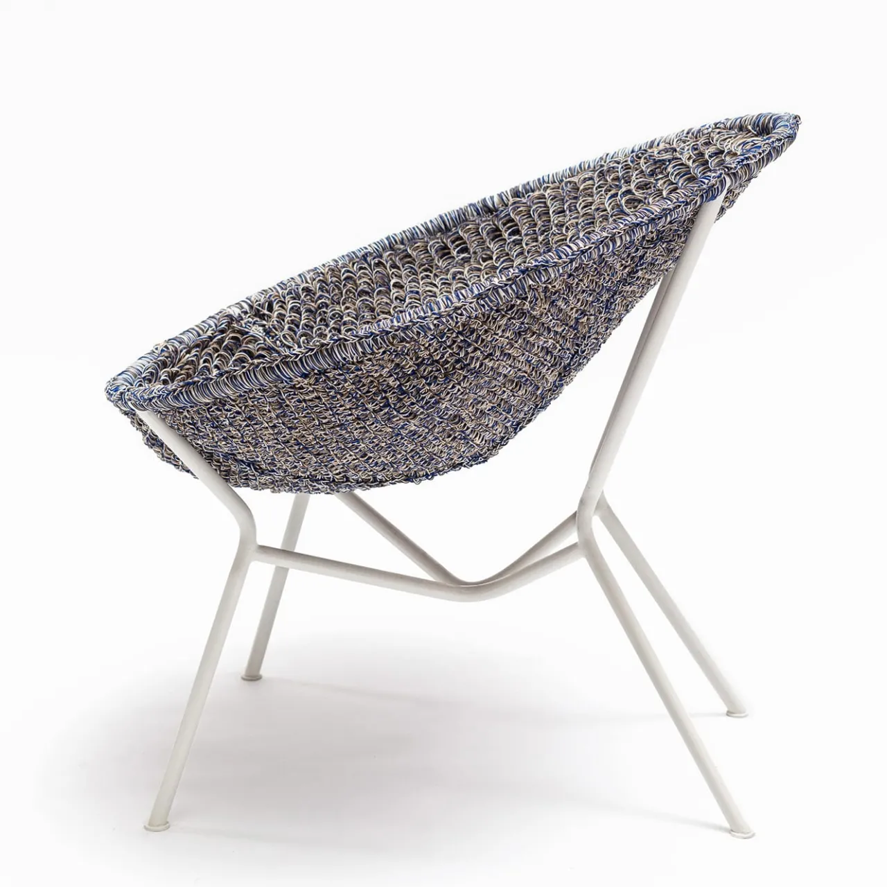 Design ispirato alle sedute da esterno con struttura metallica circolare, solitamente decorate in vimini o paglia, in voga negli anni Cinquanta. La reinterpretazione di Craafts prevede una lavorazione estremamente elaborata del pannello della seduta che contrasta con la semplicità strutturale del tubo metallico verniciato a polvere. La lavorazione all’uncinetto del filo di PVC è eseguita da esperti artigiani e garantisce una comoda seduta impermeabile e rilassante per uso esterno.
