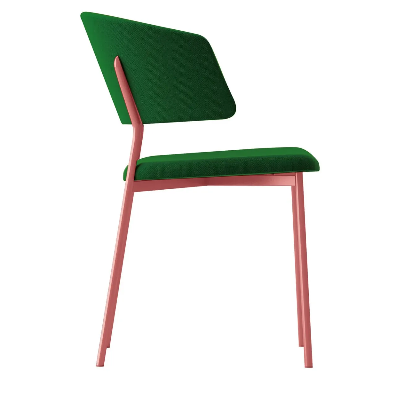Ricca di fascino elegante, questa sedia è stata progettata come una sintesi colorata tra eccentricità e semplicità. La struttura minimalista in tubolare metallico è laccata di un vivace colore rosa (RAL 3017) che contrasta armoniosamente con la tonalità verde del tessuto (rif. Flamenco 7005) con cui sono rivestiti sia il sedile imbottito che l’avvolgente schienale. La seduta è alta 47 cm.