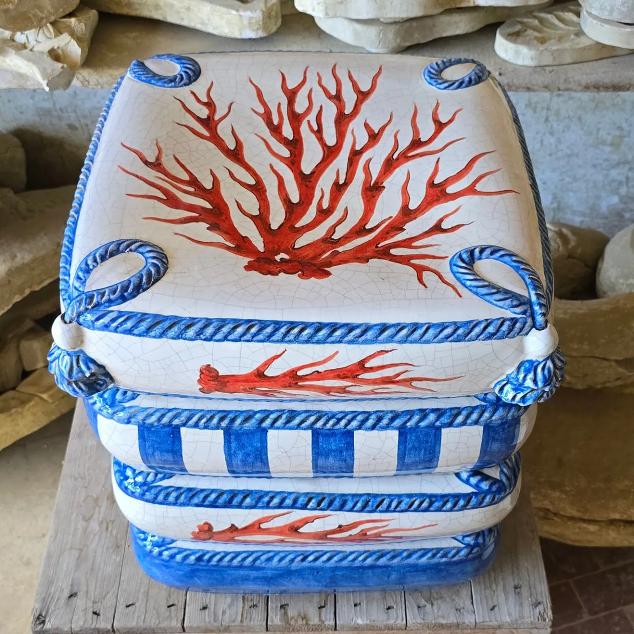 Uno sgabello versatile con un design contemporaneo che ricorda quattro cuscini impilati. Realizzato e decorato a mano, il pezzo presenta intricati motivi di corallo rosso accentuati da bordi e strisce blu simili a corde. La sua forma scultorea e i dettagli vivaci lo rendono un oggetto d’arte funzionale accattivante, adatto a vari stili di interni.