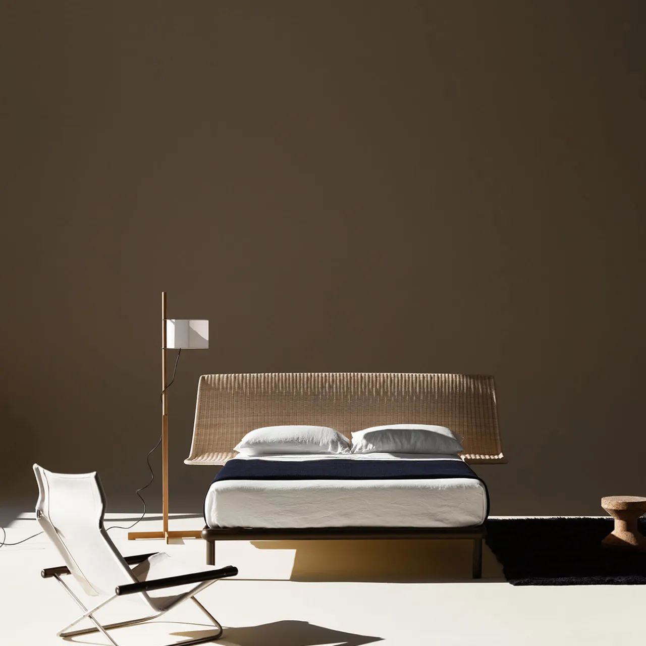 Semplicità e fluidità caratterizzano questo letto matrimoniale in stile mediterraneo, il cui spirito autentico è testimoniato in modo inequivocabile dalla luminosa testata in vimini, che incorpora nei suoi profili sinuosi anche i comodini incorporati. I piedi e la struttura presentano una sezione ogivale composta da tre barre di ferro battuto a mano sapientemente unite tra loro. Questo raffinato complemento per camere da letto esclusive, moderne o di ispirazione vintage, è un must.