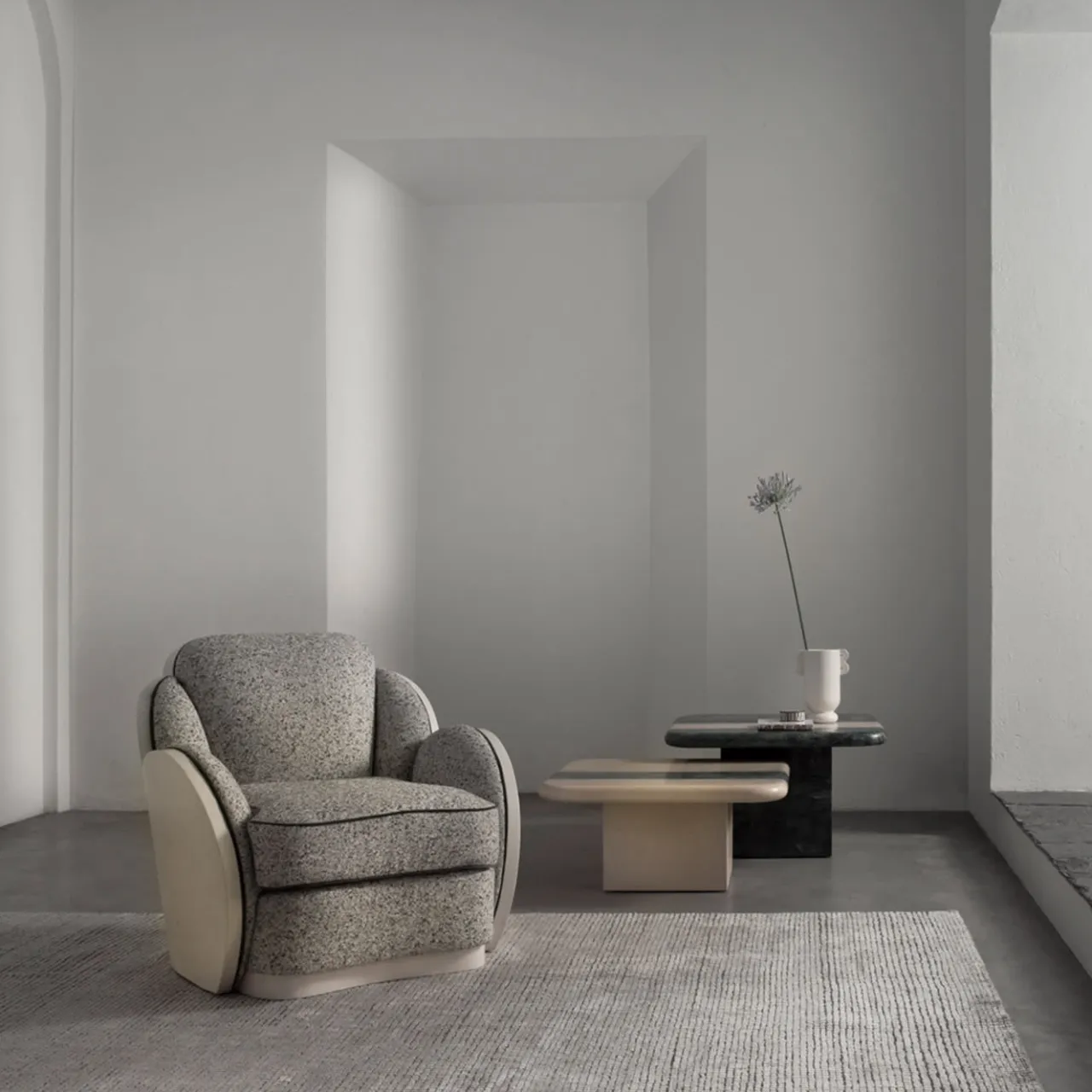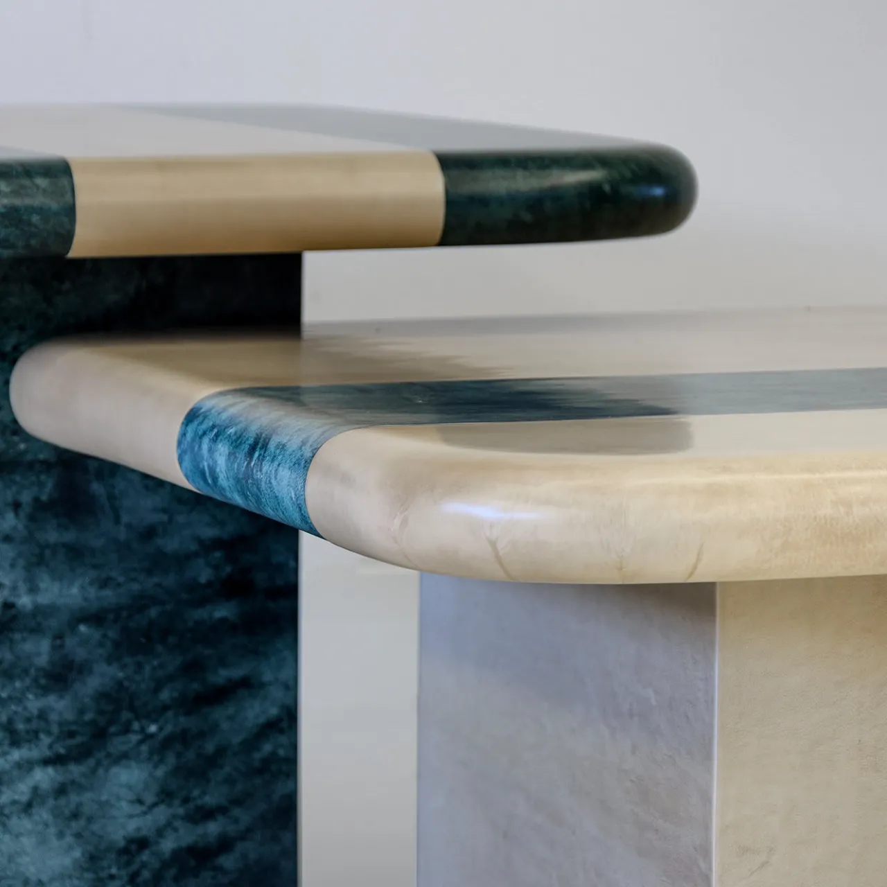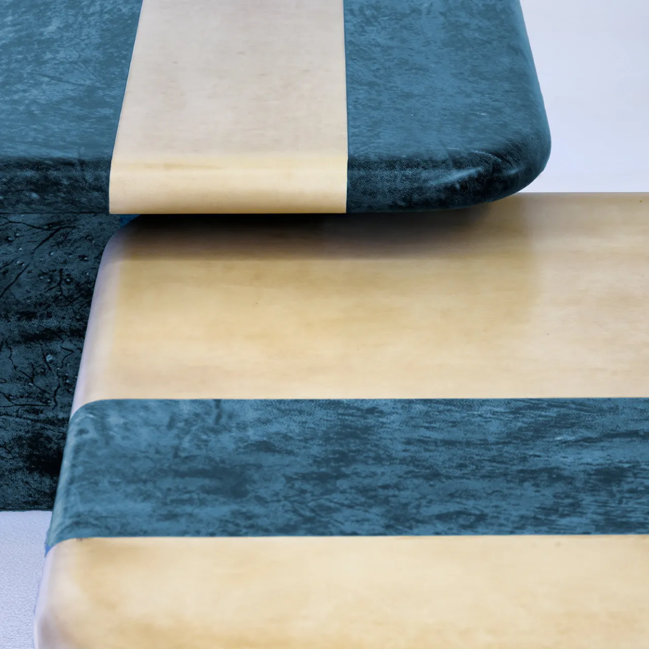Realizzato con una meticolosa attenzione alla qualità e ai dettagli, questo set di tavolini è definito da un piano quadrato decorato con lo stesso motivo geometrico in colori invertiti: blu-verde con striscia sabbia per quello alto (80 X 80 X H46cm) e sabbia con striscia blu-verde per la versione bassa (80 X 80 X H36cm). Per aggiungere un forte carattere visivo a un insieme di sedute, la base a piedistallo e i piani quadrati sono realizzati in legno massiccio rivestito in pelle di capra pergamena con finitura opaca ed effetto vintage. I tavoli possono essere acquistati anche separatamente; per maggiori dettagli, rivolgersi al Concierge.