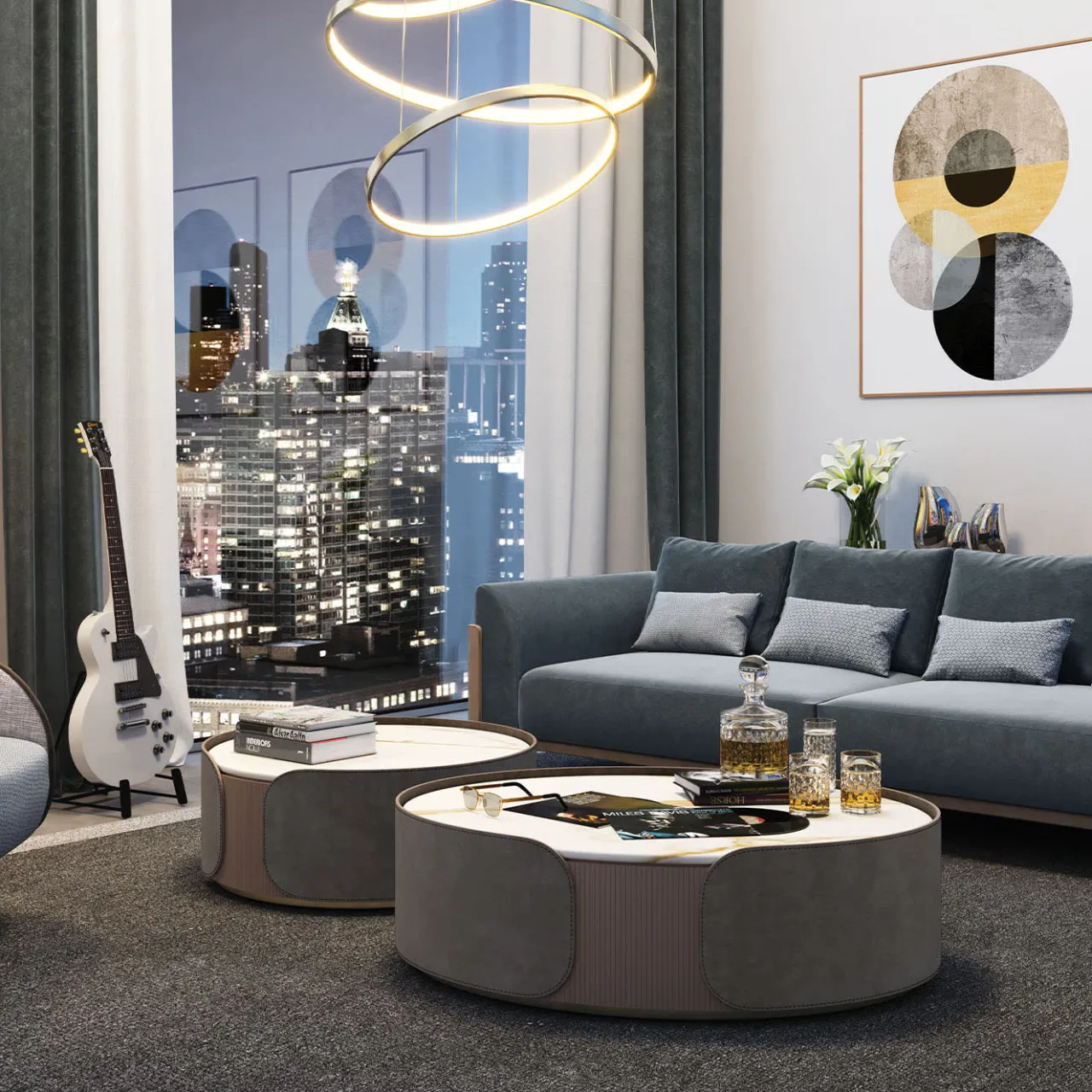 Questo set di 2 tavoli circolari, dal fascino versatile, eleva senza sforzo l’arredamento di un salotto contemporaneo. La struttura è parzialmente rivestita in pelle scamosciata grigia, mentre la parte restante rivela una base in legno laccato champagne con finitura cannellata che si abbina al piano in marmo Calacatta Glod. Il set comprende un tavolo circolare e uno ovale; per ulteriori dettagli e istruzioni di manutenzione, contattare il Concierge.