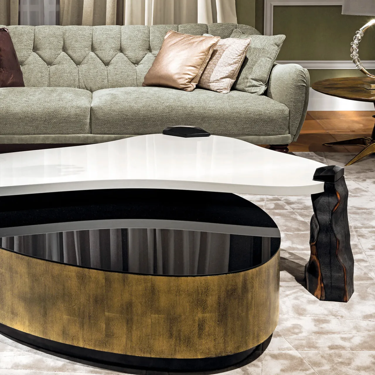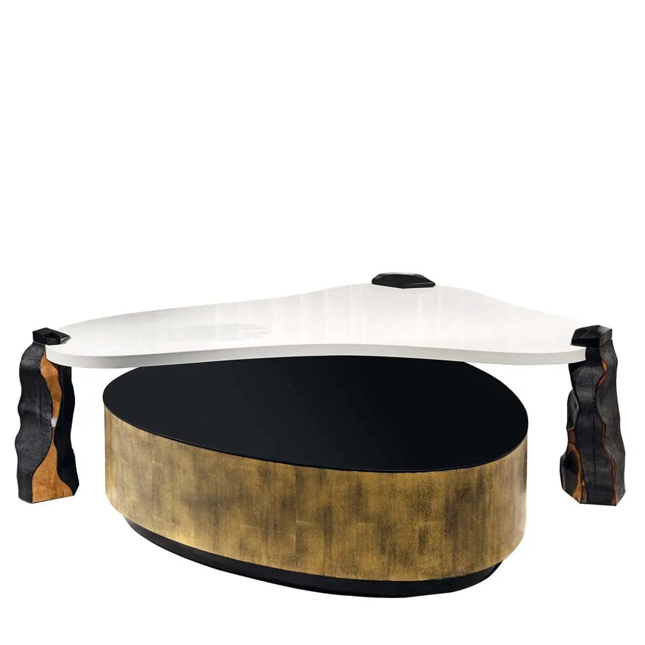 Un design scultoreo e modulare di ineguagliabile raffinatezza, questo set di due tavolini da caffè presenta un elemento inferiore impreziosito da una finitura in foglia d’oro e da un piano in vetro nero specchiato, e un elemento superiore che sfoggia gambe in rovere bruciato e un piano laccato in madreperla. Per ulteriori dettagli e opzioni di personalizzazione, consultare il Concierge.
