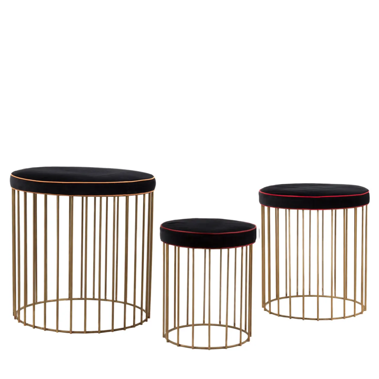 Questo set di tre sedute con cuscino è completo di una misura piccola, media e grande. I morbidi cuscini sono sostenuti da una delicata struttura a gabbia di forma cilindrica, fusa in ottone naturale e ottimamente rifinita. Le sedute sono dotate di cuscino nero con dettagli in arancione, rosso e vino. Piccolo: 16 x 18 pollici, medio: 20 x 20 pollici, grande: 22 x 22 pollici.