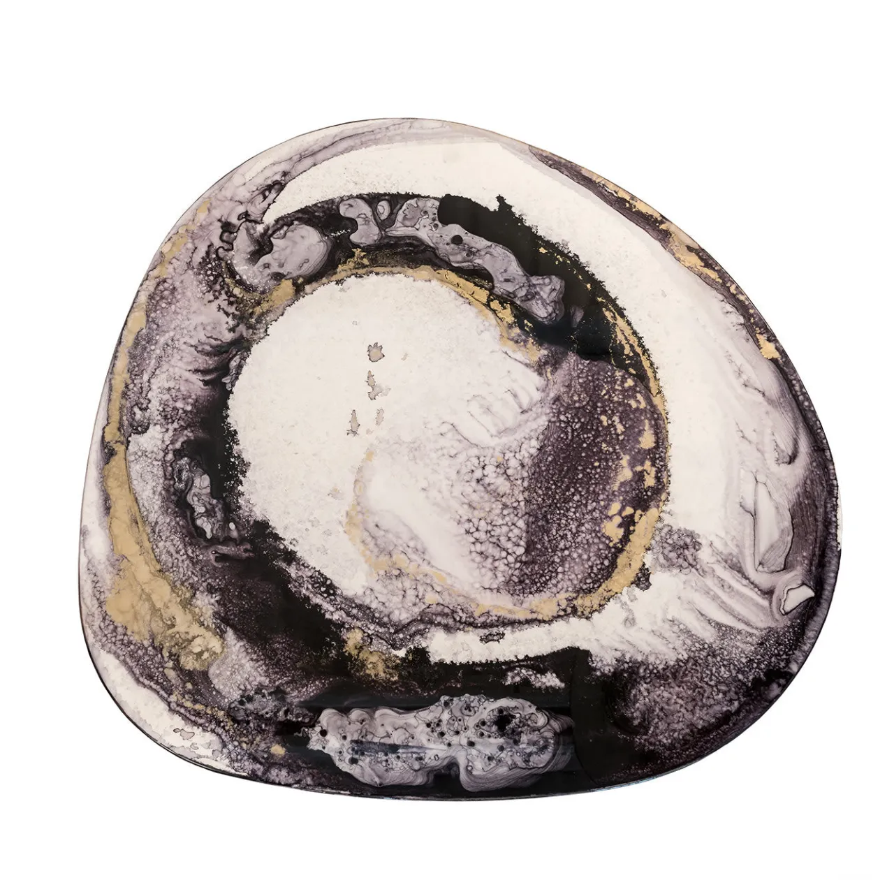 Questo set di due tavolini è realizzato in poliestere lucido, dipinto a mano con un motivo dinamico a vortice in bianco e nero. Entrambi i tavolini sono dotati di gambe in legno verniciate di nero e rifinite in ottone. I loro piani curvi, organici e unici, conferiscono un tocco di modernità a qualsiasi ambiente. Poiché ogni tavolo è dipinto a mano, non esistono due pezzi uguali. Personalizzabile.