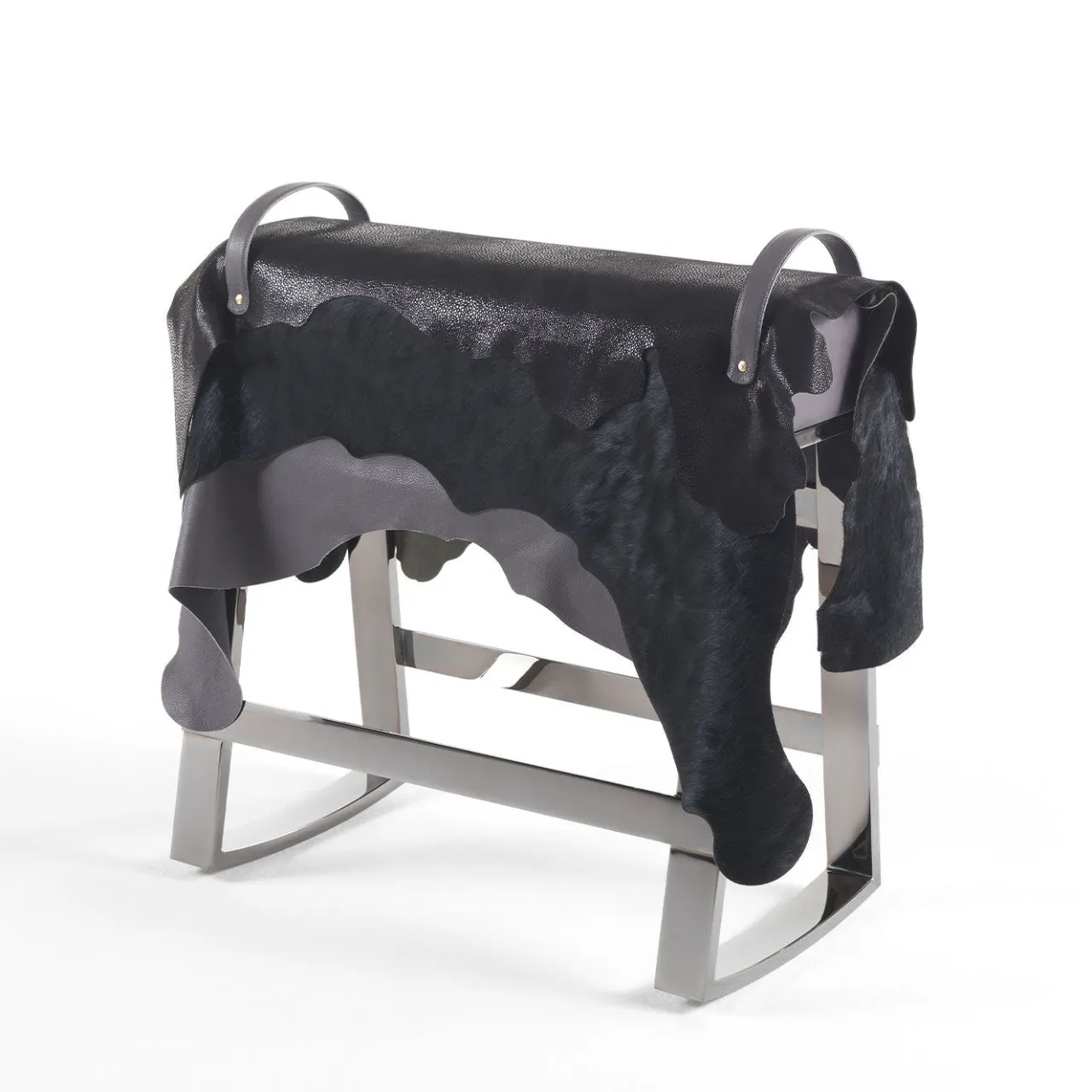“Il potere creativo dell’uomo e la bellezza della natura: un binomio in costante ricerca di equilibrio, che trova la sua perfetta espressione in Agaxa. I molteplici strati di pelle che ricoprono la struttura metallica trasformano lo sgabello in una creazione potente, sfumando il confine tra arte e design.” Sgabello a dondolo con struttura in metallo con finitura cromata nera. Seduta con struttura in legno multistrato e poliuretano espanso ad alta densità. Rivestimento con tre diversi strati di pelle: pelle Horsy nera, pelle ray nera e pelle anilina grigia. Maniglie in pelle anilina grigia con bottone in ottone. Dettagli della variante: Sgabello a dondolo con struttura in metallo con finitura oro opaco o cromo nero. Seduta con struttura in legno multistrato e poliuretano espanso ad alta densità. Rivestimento in tre diversi strati di pelle. Maniglie in pelle con bottone in ottone.