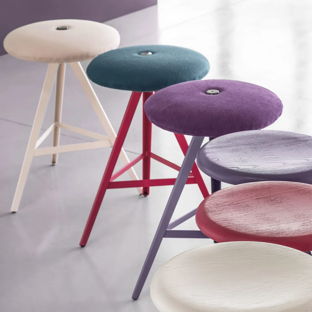 Pratico e funzionale, questo sgabello disegnato da Emilio Nanni completerà in modo ideale gli spazi contract o residenziali se accostato ad altri di colori diversi. Caratterizzato da una tonalità rosa cipria che abbina la struttura in metallo alla seduta in frassino massiccio rivestita in tessuto (finitura: cat. D Camira Era CSE19), poggia su un accattivante treppiede arricchito da elementi orizzontali che fungono da poggiapiedi. Personalizzabile nel colore su richiesta.