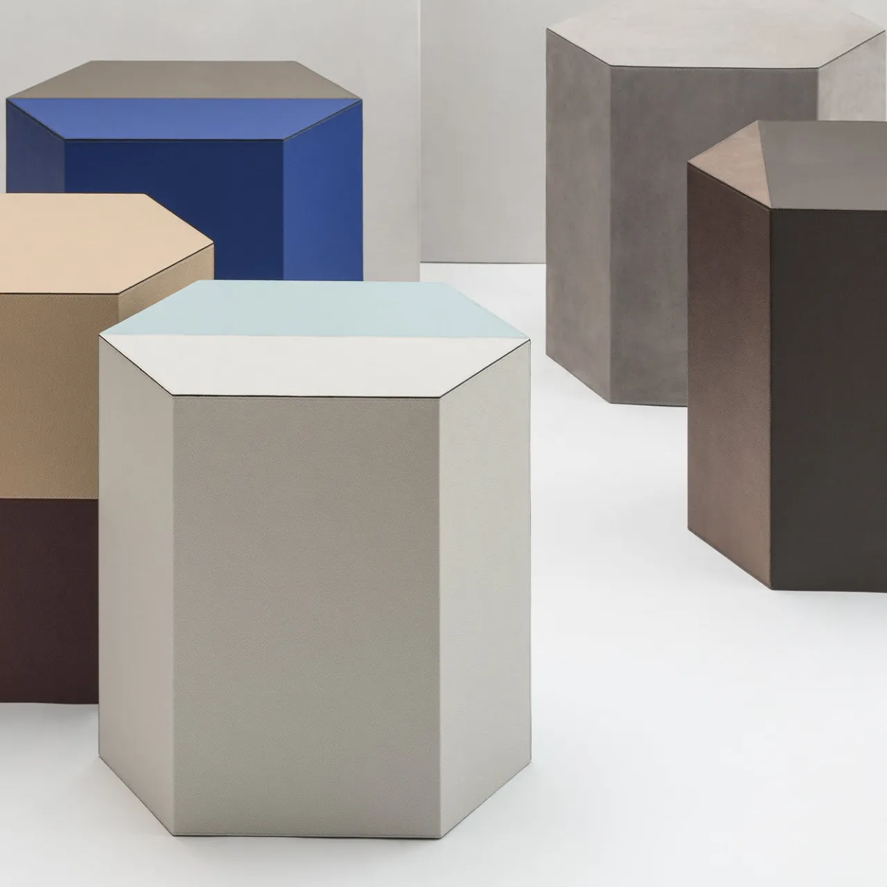 Geometrie semplici esaltate da eleganti accostamenti cromatici ispirano la collezione Atlas di sgabelli e tavolini rivestiti in pelle disegnati da Stéphane Parmentier per Giobagnara. La silhouette esagonale di questo sgabello, montato su ruote nascoste per una maggiore funzionalità, è divisa orizzontalmente in due colori, marrone alla base e beige sulla parte superiore. La collezione è disponibile in tinta unita e in tre modelli bicolore, a righe orizzontali, verticali e centrali.