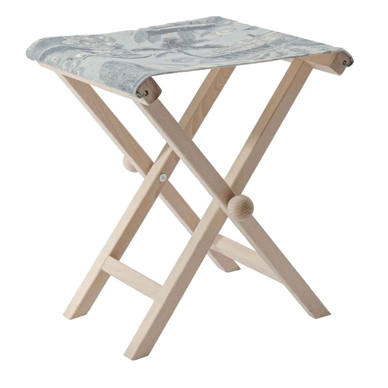 Poltroncina pieghevole in faggio massiccio caratterizzata dall’inserimento di fregi e modanature in legno tornito. Tessuto in cotone stampato con grafica Costiera Amalfitana/Capri, comprensivo di cuciture e asole per l’inserimento delle bacchette di fissaggio in legno. Il faggio naturale grezzo, non trattato, invecchierà come tutte le materie prime.