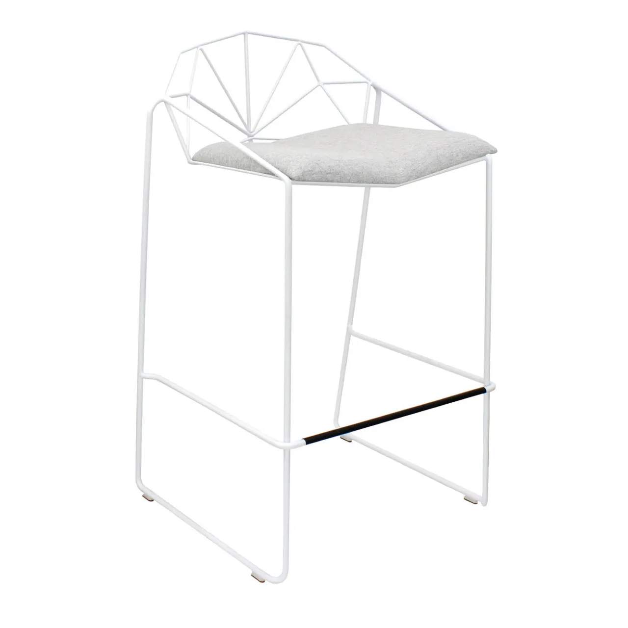 Lo sgabello Capri bianco e grigio presenta un design geometrico moderno con una raffinata struttura opaca bianca realizzata in tondini metallici. La seduta imbottita è realizzata in lana 100% riciclata, offrendo comfort e un tocco ecosostenibile. Questo sgabello unisce stile contemporaneo e materiali sostenibili, risultando ideale per arredare con gusto banconi bar o cucine. Lo schienale aperto dalle linee angolari aggiunge interesse visivo mantenendo un’estetica minimalista.