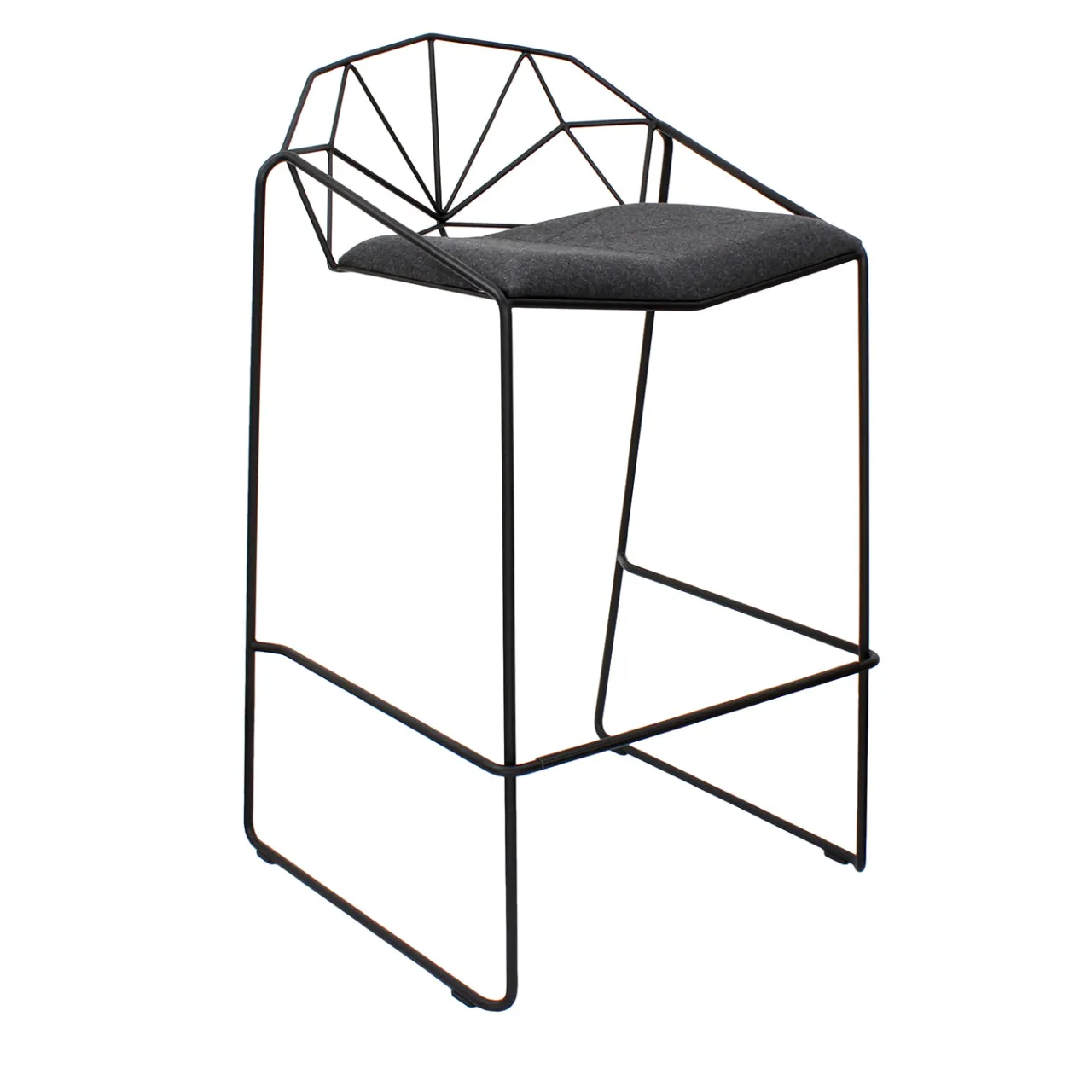 Lo sgabello Capri nero e grigio carbone presenta un design geometrico moderno con una raffinata struttura opaca nera realizzata in tondini metallici. La seduta imbottita è realizzata in lana 100% riciclata, offrendo comfort e un tocco ecosostenibile. Questo sgabello unisce stile contemporaneo e materiali sostenibili, risultando ideale per arredare con gusto banconi bar o cucine. Lo schienale aperto dalle linee angolari aggiunge interesse visivo mantenendo un’estetica minimalista.