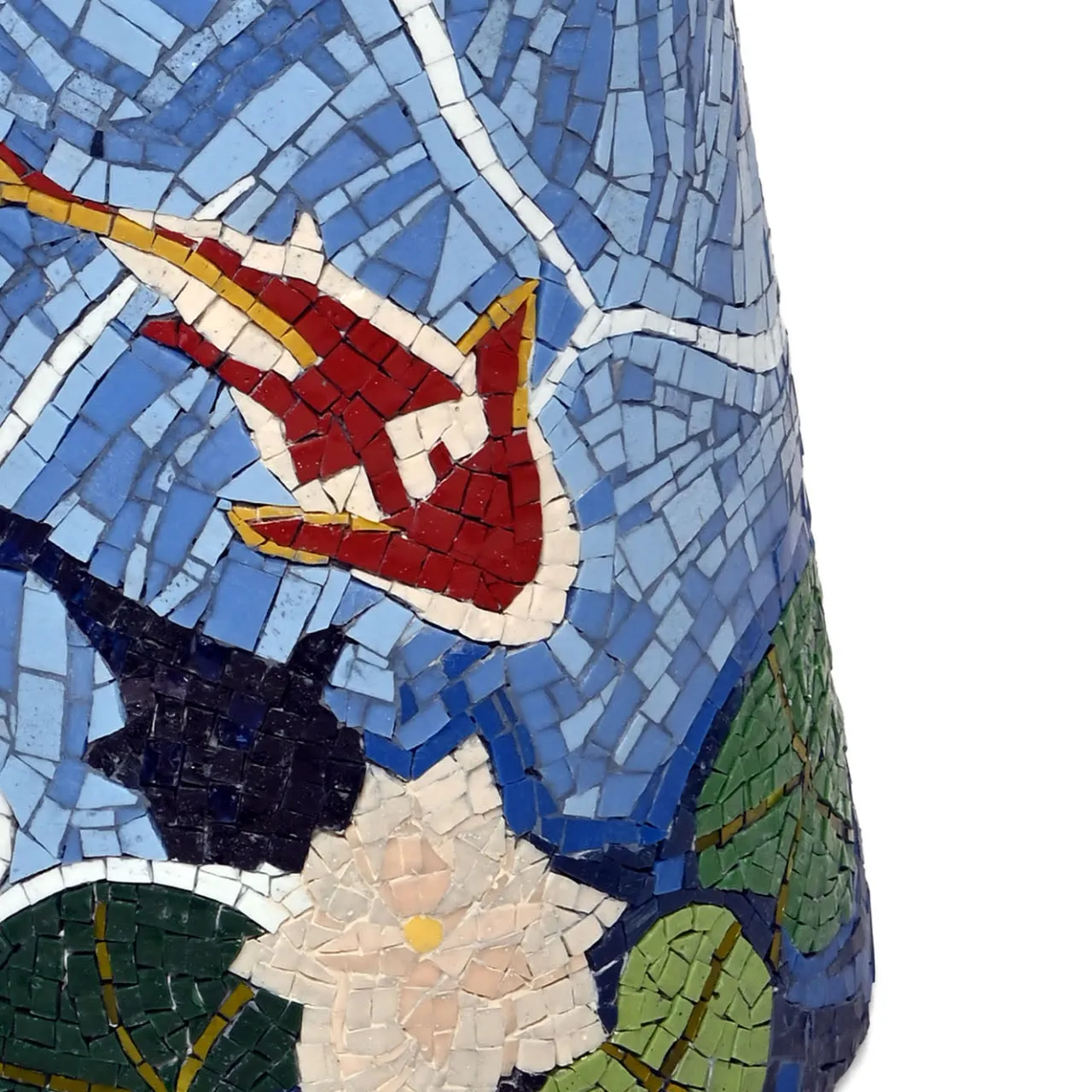 Più di 4.000 mosaici sono stati tagliati e assemblati uno per uno dalle mani esperte di Michela Nardin, utilizzando 10 diverse tonalità di colori per 65 ore. Le Carpe KOI si sono godute il loro momento nella Laguna di Venezia, cristallizzandosi magicamente in mosaici di vetro di acque blu e fiori di Loto. Questo pezzo è unico.