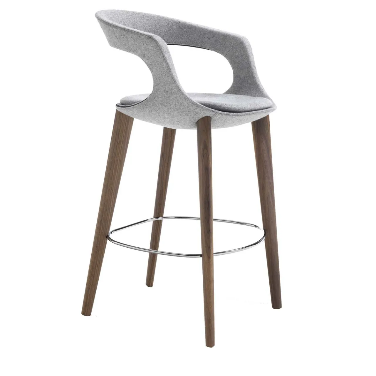 Progettato e realizzato in Italia, questo sgabello da banco combina un design elegante e moderno con gambe in legno naturale per uno stile elegante e accogliente. Le gambe sottili e slanciate sembrano sospendere a mezz’aria la seduta rivestita in feltro. Un poggiapiedi cromato completa l’articolo. Disponibile nel colore Silverdale e in altre tonalità e finiture. Prezzo su ordinazione.