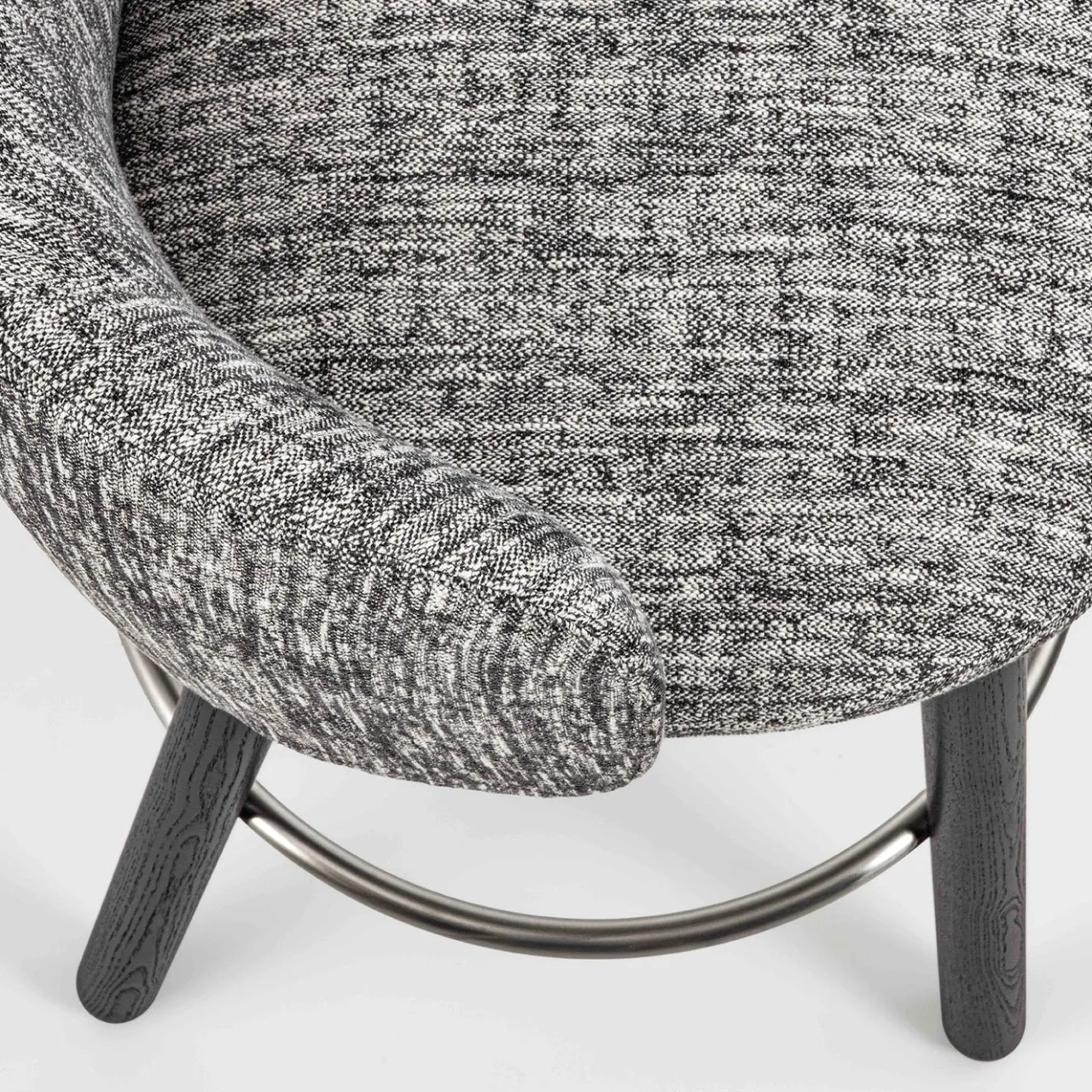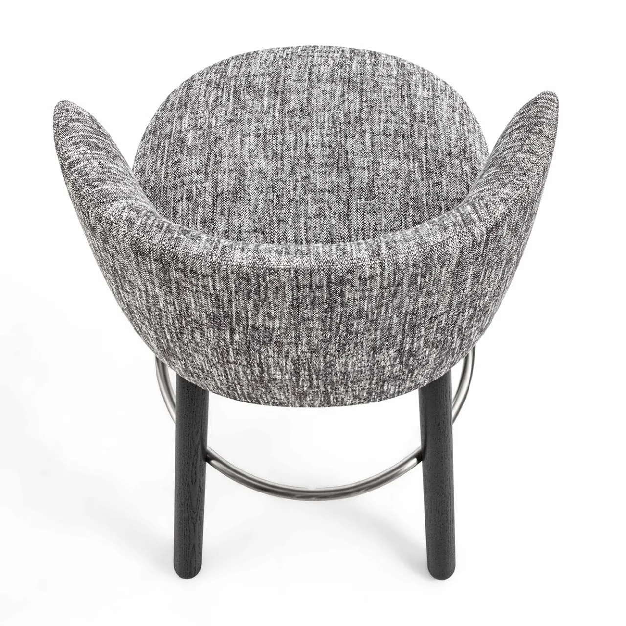 Seduta unica con struttura in acciaio, imbottitura in poliuretano espanso rivestita in materiale diverso. Questo sgabello combina design moderno e materiali di alta qualità, rendendolo un elemento distintivo per qualsiasi spazio. Base a quattro gambe in legno tornito disponibile in frassino o noce canaletto.