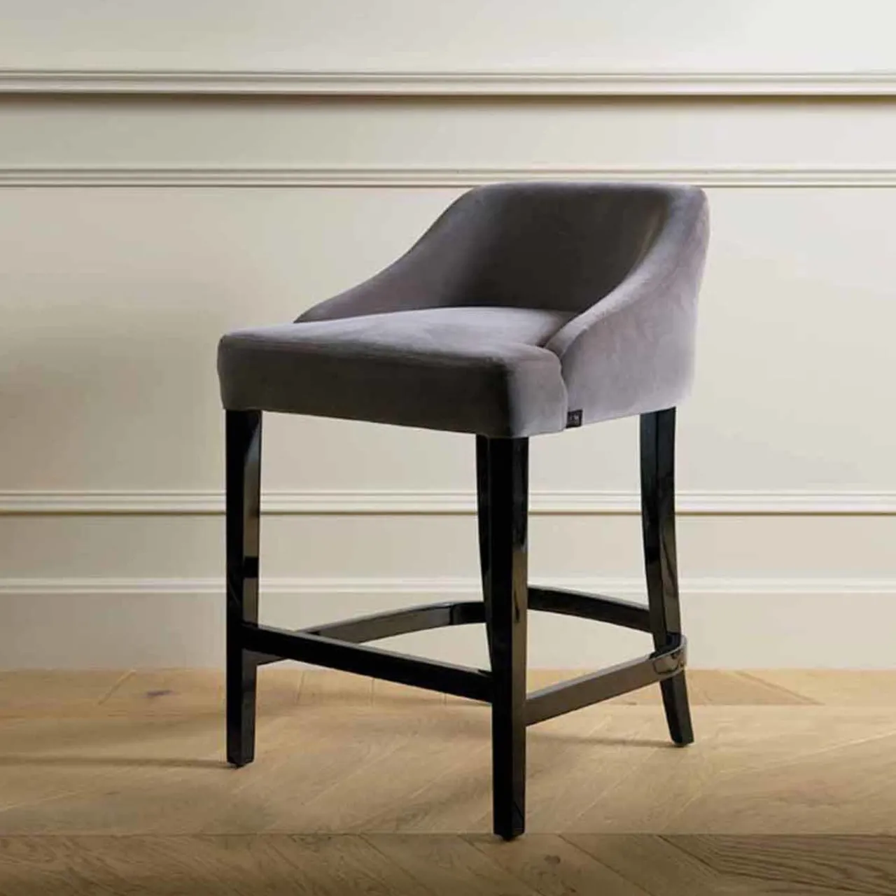 Parte della Collezione Vicky, una delle prime linee disegnate da Domenico Mula per DOM Edizioni, questo sgabello da bar è comodo ed elegante. La sua base alta è composta da quattro gambe collegate da elementi orizzontali che fungono da poggiapiedi, tutti rifiniti in lacca nera lucida, con le gambe posteriori curvate in una delicata silhouette a sciabola. Il piano si distingue per l’ampia seduta e lo schienale corto con rivestimento in tessuto grigio (cat. 3).