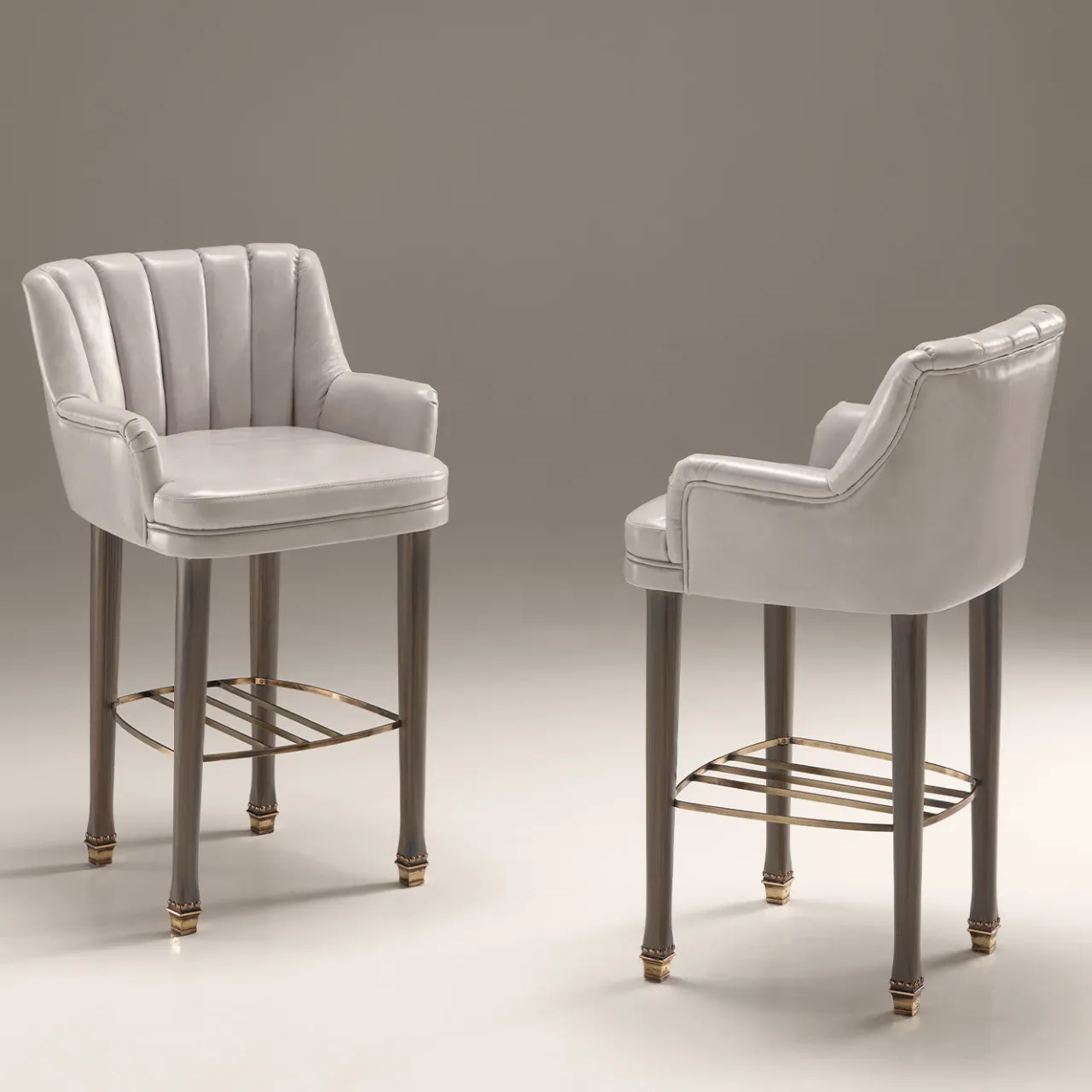 Una raffinatezza senza tempo definisce lo sgabello Brio della collezione Interior Studio, una sublime dimostrazione di maestria artigianale e una testimonianza di estetica elegante. Realizzato a mano in legno massiccio, con una morbida imbottitura in poliuretano, è rivestito in pelle grigio chiaro e poggia su gambe in legno impreziosite da dettagli in ottone.