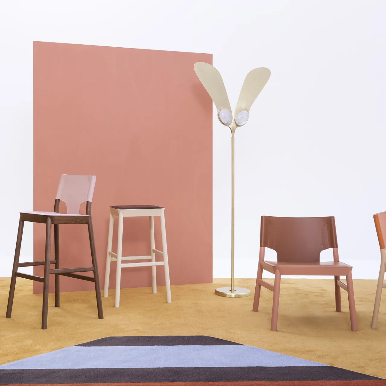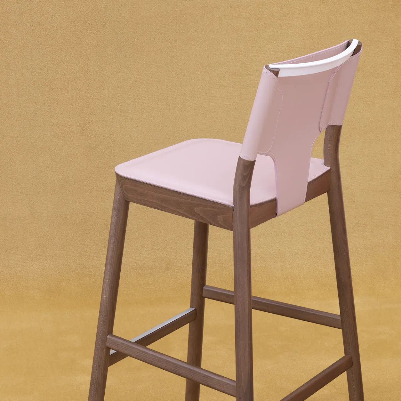 Disegnato da Emilio Nanni, lo sgabello Marimba unisce legno e pelle in una felice armonia tra stabilità e agilità. In legno massello di faggio tinto noce e rivestito in similpelle rosa, lo sgabello è dotato di una maniglia in acciaio bianco per aiutarvi a spostarlo. Sono disponibili anche una poltrona lounge e una sedia da pranzo.