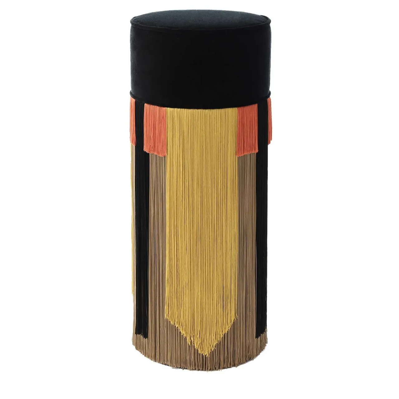 Giocoso ed eclettico, questo elegante sgabello da bar attirerà l’attenzione in un interno moderno, posizionato accanto a un bancone rialzato come seduta extra o in qualsiasi stanza della casa per aggiungere un accento materico e colorato. La sua struttura in faggio verniciato è imbottita nella parte superiore con una fodera sintetica rivestita di cotone e viscosa neri. L’elemento distintivo di questo pezzo è la decorazione di frange che cadono dal basso verso l’alto, creando un disegno geometrico nei colori nero, marrone, giallo e rosso per un effetto di grande impatto. Ogni pezzo su misura è timbrato nella parte inferiore della fodera del pouf, firmato, numerato e datato personalmente dalla designer Lorenza Bozzoli. L’autenticità originale di ogni prodotto evidenzia la qualità artigianale e l’arte di un design di lusso dedicato. Ogni pezzo su misura è impresso sul fondo della fodera del pouf e firmato, numerato e datato personalmente dalla designer.