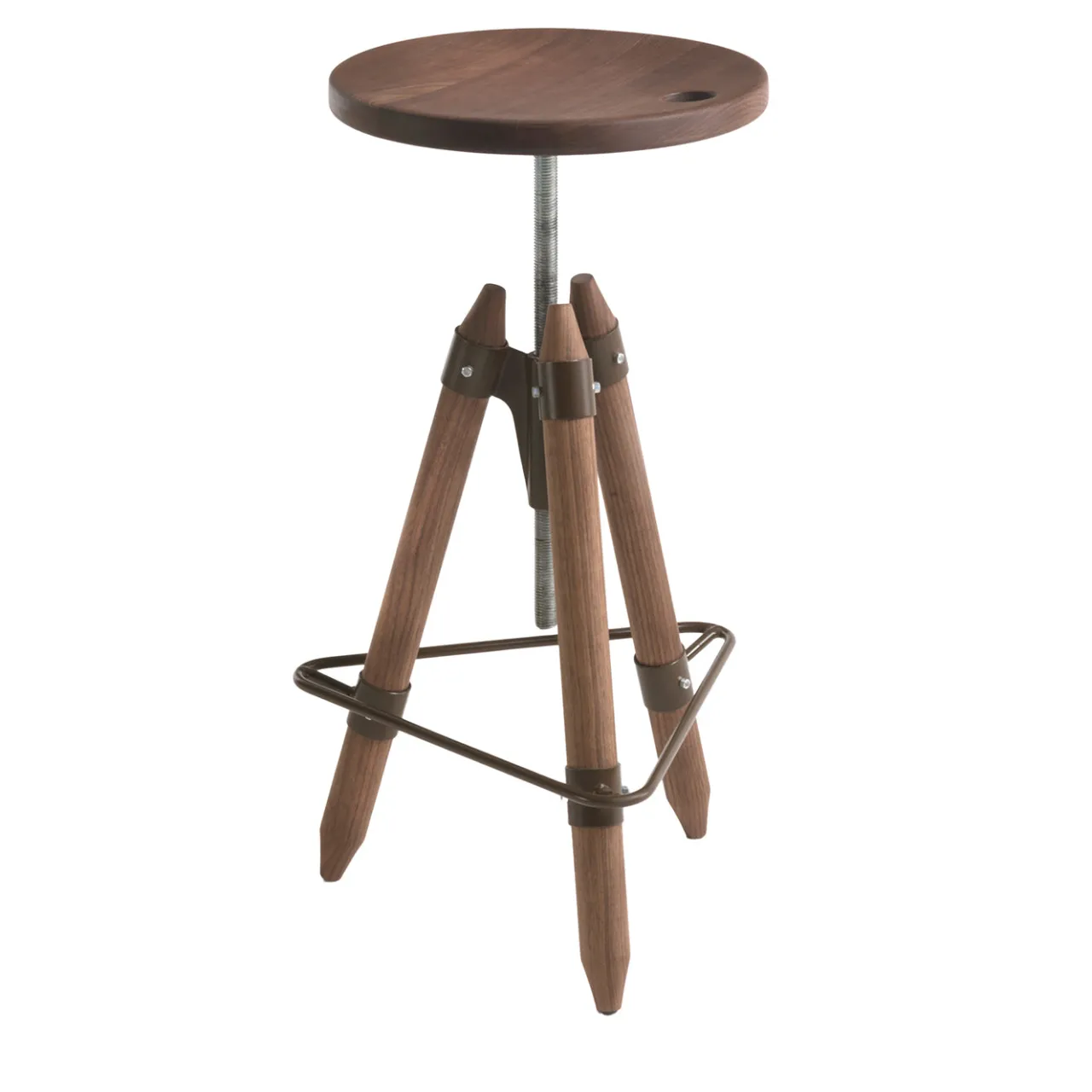 Lo sgabello da bar Ello presenta una seduta rotonda e liscia, girevole e regolabile in altezza per un comfort personalizzato. Realizzato in legno di noce privo di nodi e rifinito a olio, unisce eleganza naturale e resistenza. Il poggiapiedi triangolare in ferro garantisce un supporto solido, in armonia con le robuste gambe in legno. Disegnato da Franco & Matteo Origoni, questo sgabello di medie dimensioni coniuga funzionalità e stile minimalista raffinato.