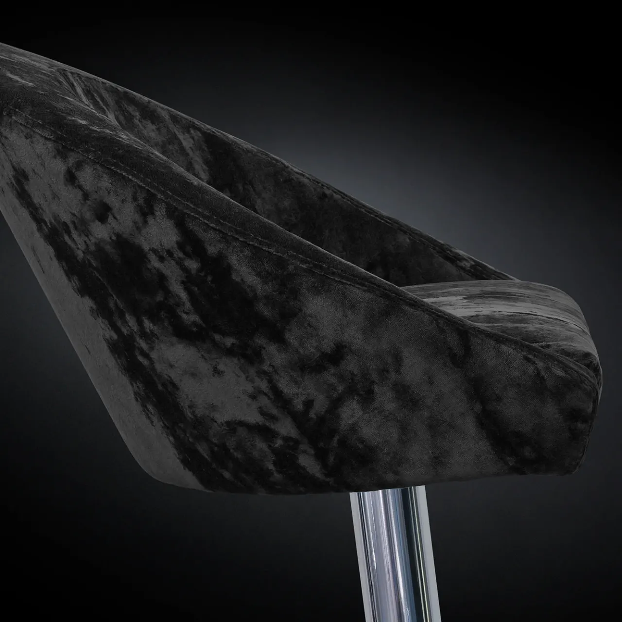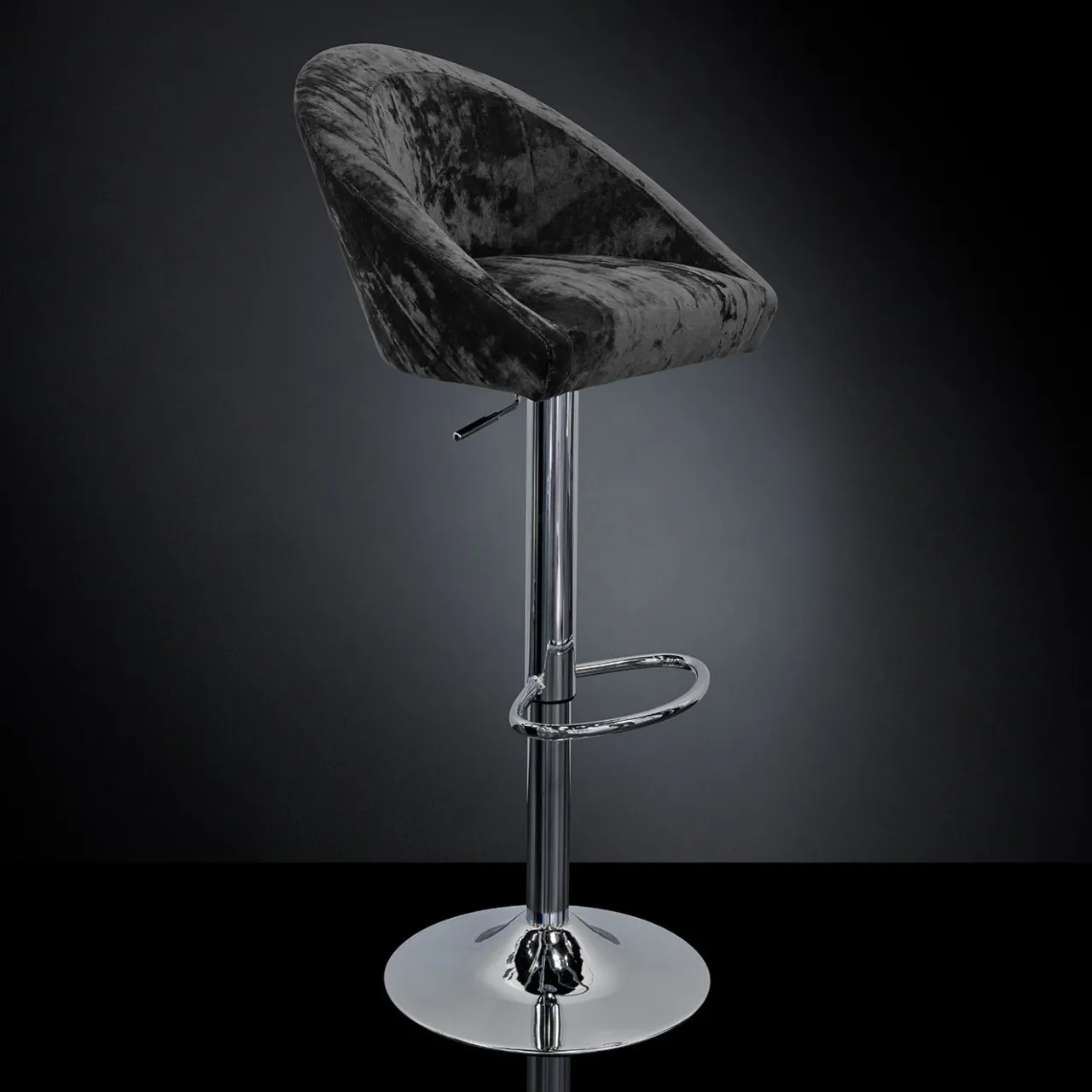 Uno sgabello da bar moderno ed elegante con seduta e schienale rivestiti in velluto nero.