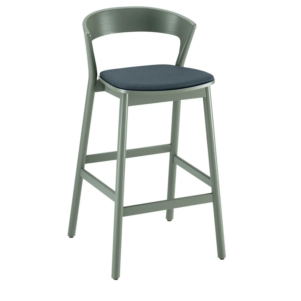 Di ispirazione scandinava, questo versatile sgabello di Massimo Broglio si adatta perfettamente sia agli ambienti residenziali che a quelli commerciali. Realizzato in legno di faggio e frassino, la sua struttura vanta una delicata tonalità verde e comprende quattro gambe dalla silhouette sottile e dall’estremità rotonda, leggermente inclinata e collegata a barre orizzontali che fungono da poggiapiedi. L’accogliente schienale completa il design della comoda seduta imbottita in legno multistrato e rivestita in un raffinato tessuto blu-verde.