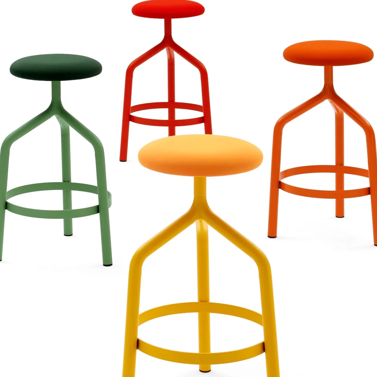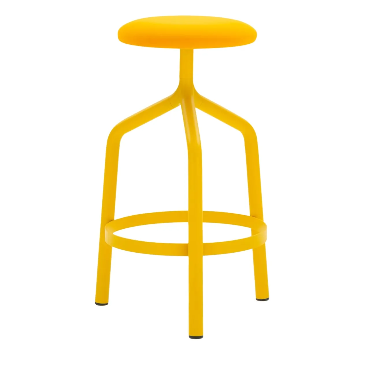 JOE, una famiglia di sgabelli in acciaio dal design contemporaneo e dal sapore industriale. Joe è la versione fissa, con un elegante snodo a tre vie in alluminio pressofuso. La base, verniciata nelle finiture metalliche della palette di colori Viganò, presenta la tipica seduta rotonda e dona un tocco di raffinatezza a colazioni, pranzi e cene. Sgabello con seduta imbottita, struttura in tubo d’acciaio diametro 35 cm, finitura gialla. Rivestito in tessuto ignifugo giallo.