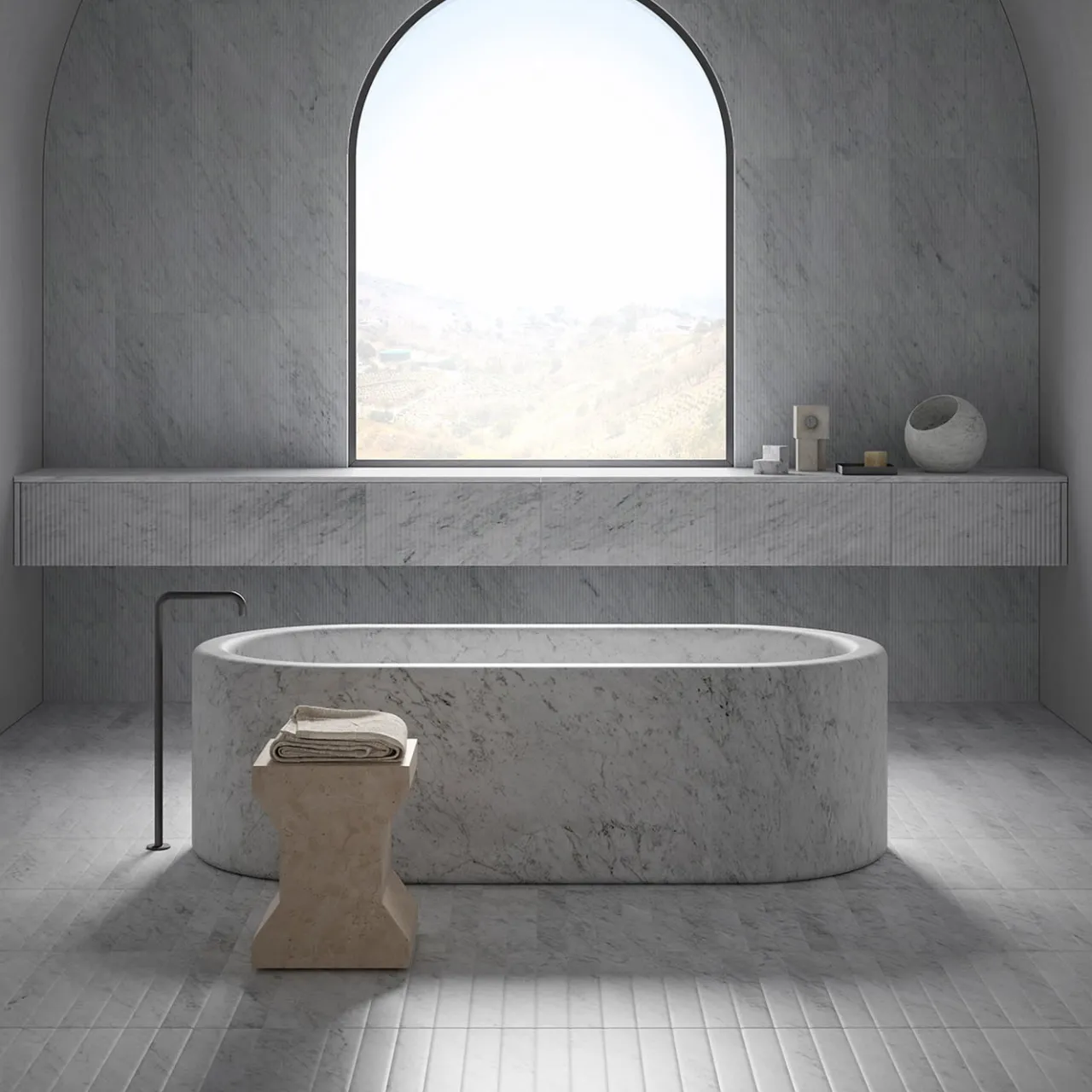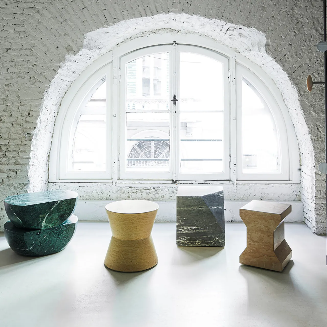In un allegro marmo rosa, lo sgabello Ikona di Elisa Ossino è accuratamente scolpito in una forma non convenzionale grazie all’occhio attento della designer Elisa Ossino. Adatto sia per interni che per esterni, lo sgabello può essere utilizzato anche come tavolino ed è dotato di ruote inferiori per facilitarne lo spostamento. Disponibile nei colori Cipollino, Giallo Egiziano e Verde Guatemala.