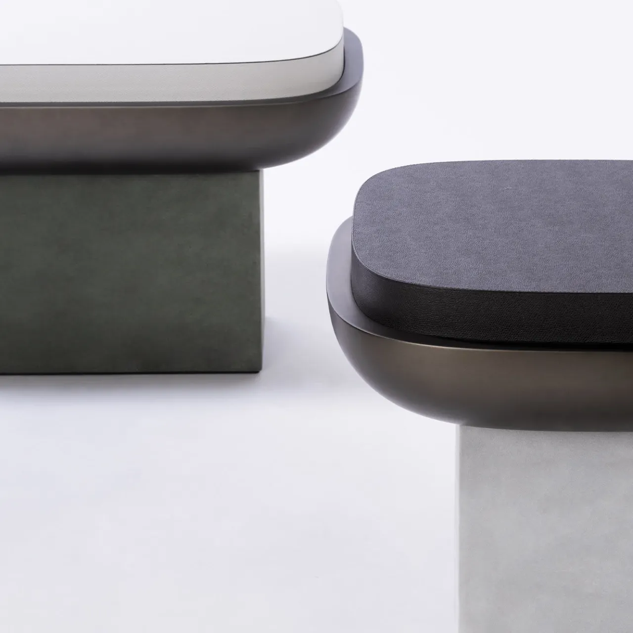 La fusione di materiali duri e lisci in un design che ricorda sia l’architettura futuristica del Parlamento del Brasile di Oscar Niemeyer sia le curve sinuose dell’architettura orientale, rende questo sgabello un pezzo speciale di arredamento funzionale, grazie alle sue linee pulite e alla palette di colori essenziali. La seduta in legno laccato scuro poggia su una base scultorea composta da una gamba a colonna rivestita in pelle scamosciata color avorio e da una ciotola in legno laccato color bronzo che conferiscono un’eleganza minimalista a questo esclusivo design di Stéphane Parmentier. La pelle è disponibile anche in nappa e vitello stampato.