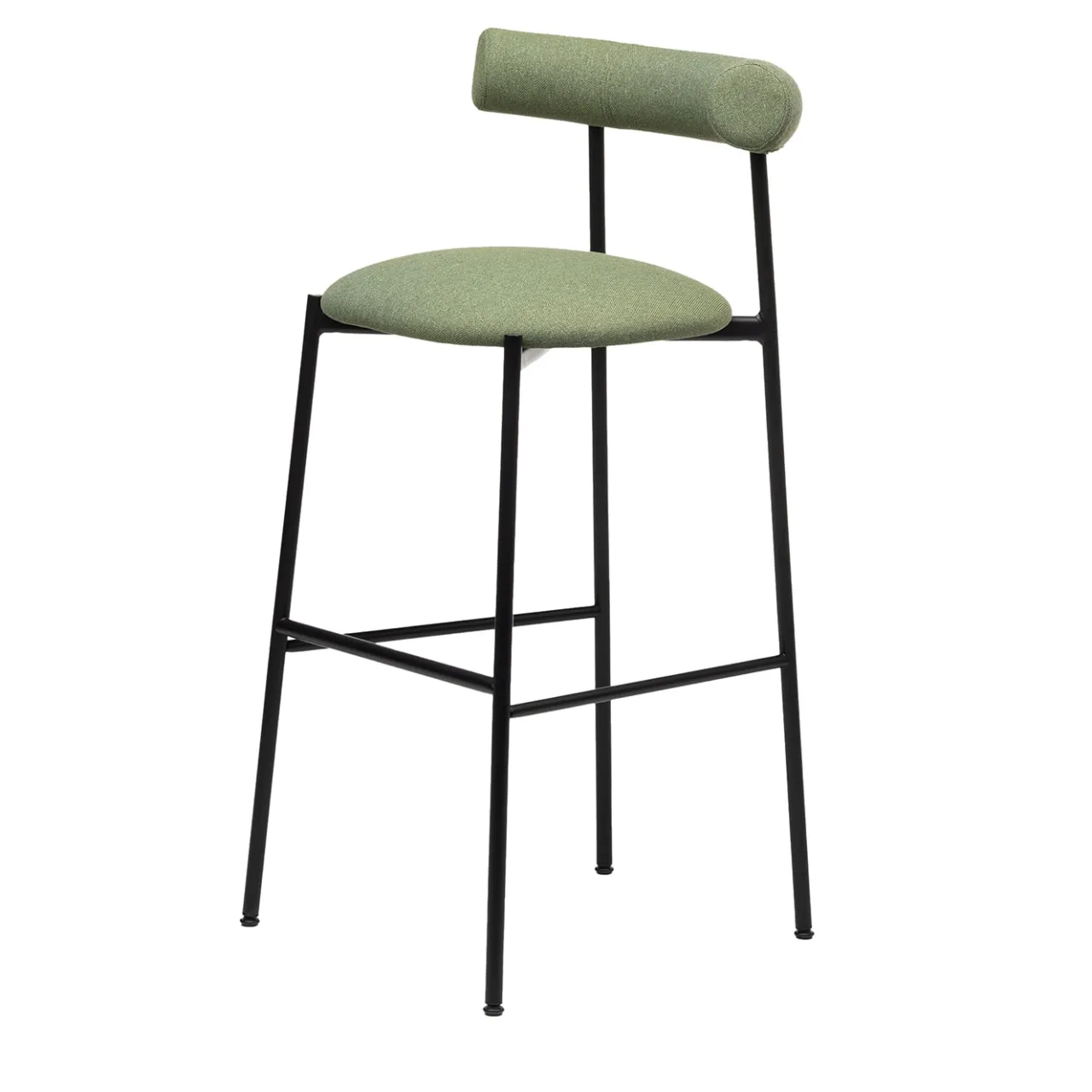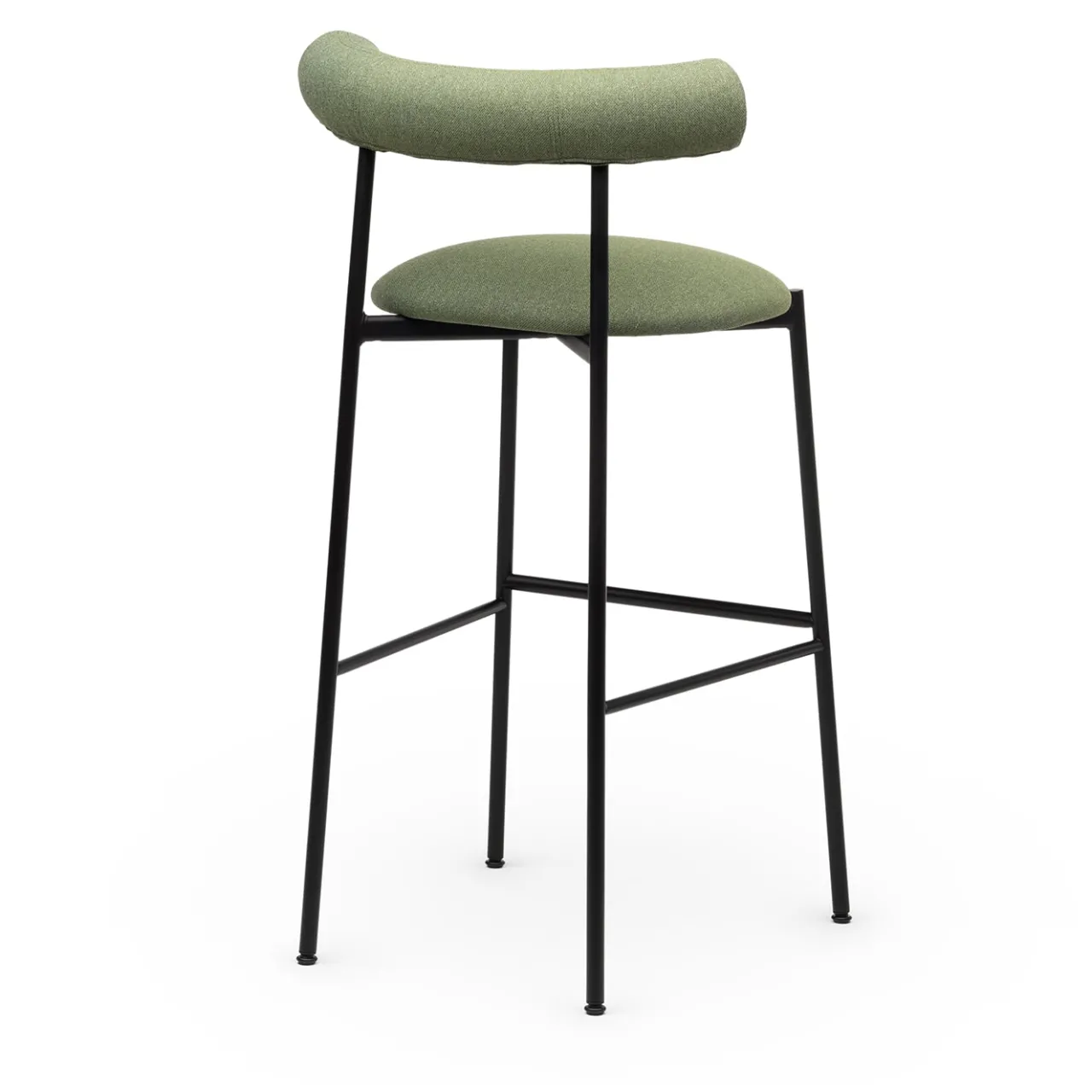 Questo sofisticato sgabello di ispirazione moderna è il punto di riferimento per garantire un comfort eccezionale al bancone del bar. Rivestito in tessuto PET riciclato di colore verde (cat. B), il sedile alto 81 cm e l’avvolgente schienale a taglio cilindrico sono generosamente imbottiti, tenuti insieme da un’ariosa e sottile struttura in acciaio verniciato a polvere in nero. Altre versioni sono disponibili nel catalogo Artemest.